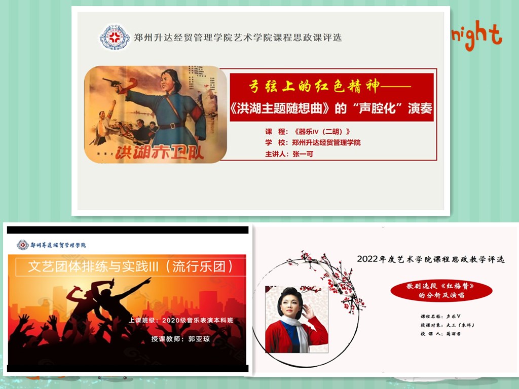 为了喜迎中国共产党第二十次全国代表大会的胜利召开,贯彻教育部《高等学校课程思政建设指导纲要》(教高〔2020〕3号)精神和河南省《关于推进本科高校课程思政建设的指导意见》(教高〔2020〕314号),切实推进学院课程思政教育教学工作,艺术学院经过领导班子商议决定,10月17日晚,艺术学院通过钉钉平台成功举办课程思政评选活动决赛。在全院教师中开展了一场课程思政评选活动。