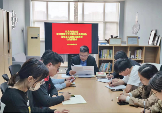 2023年5月6日上午,就业处党支部在学苑会馆四楼就业工作坊召开学习贯彻习近平新时代中国特色社会主义思想主题教育动员部署会。全体就业处党支部成员参加会议,由支部书记冯科同志主持。