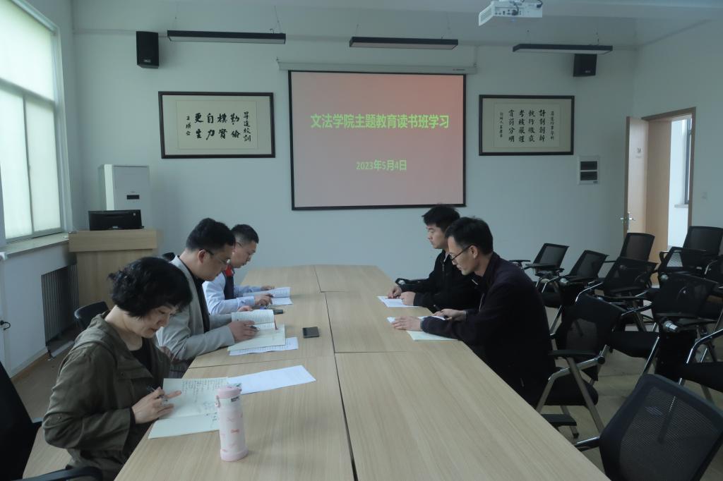 为学习贯彻习近平新时代中国特色社会主义思想主题教育,5月4日下午,文法学院在教学1号楼314会议室召开读书班第一次学习会,参加会议的有院党委书记刘晓川、院长段丰乐、统战委员兼教学秘书李南方、组织委员兼行政秘书郑玲玲、组织员金东亮,会议由院党委书记刘晓川主持。