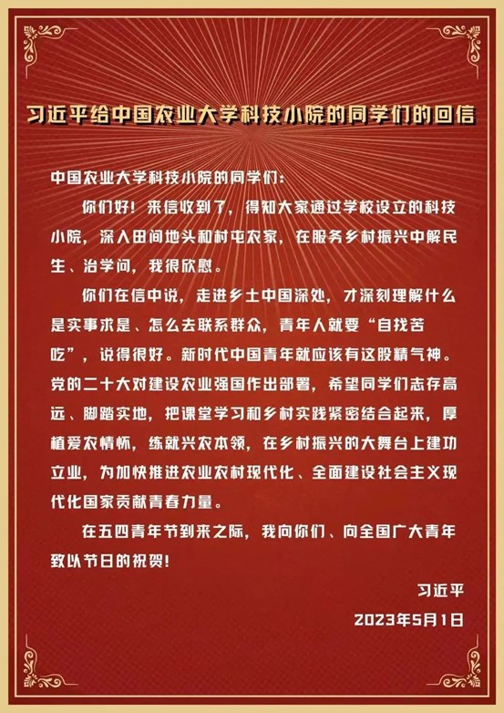中共中央总书记、国家主席、中央军委主席习近平近日给中国农业大学科技小院的同学们回信,提出殷切期望,并在五四青年节之际,向全国广大青年致以节日的祝贺。