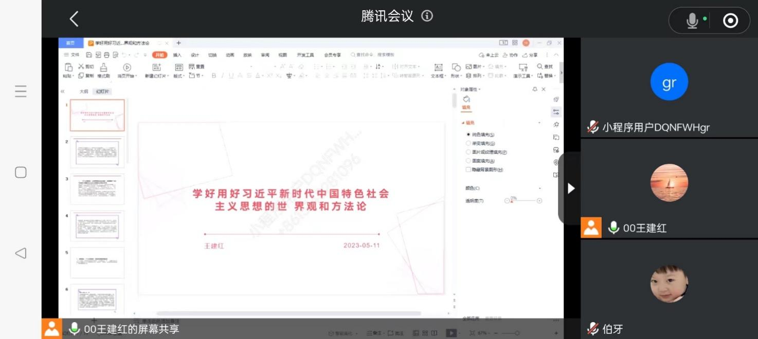 首先,支部书记王建红老师紧扣主题,深入浅出为大家讲解“六个必须坚持”的丰富内涵。他指出,党的二十大报告提出的“六个必须坚持”是继续推进理论创新的科学方法,也是习近平新时代中国特色社会主义思想的立场观点方法的重要体现。他强调,要深刻理解领悟习近平新时代中国特色社会主义思想的世界观和方法论,知其言更知其义、知其然更知其所以然,真正把马克思主义看家本领学精悟透用好。随后,组织委员高珊珊老师带领支部成员共同学习了《习近平新时代中国特色社会主义思想的世界观和方法论专题摘编》节选内容。最后,大家结合近期学习情况,畅谈心得体会。
