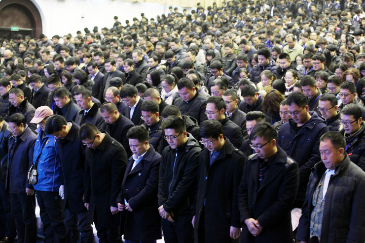 大会开始,全场肃然起敬,全体起立向创办人王广亚博士默哀。