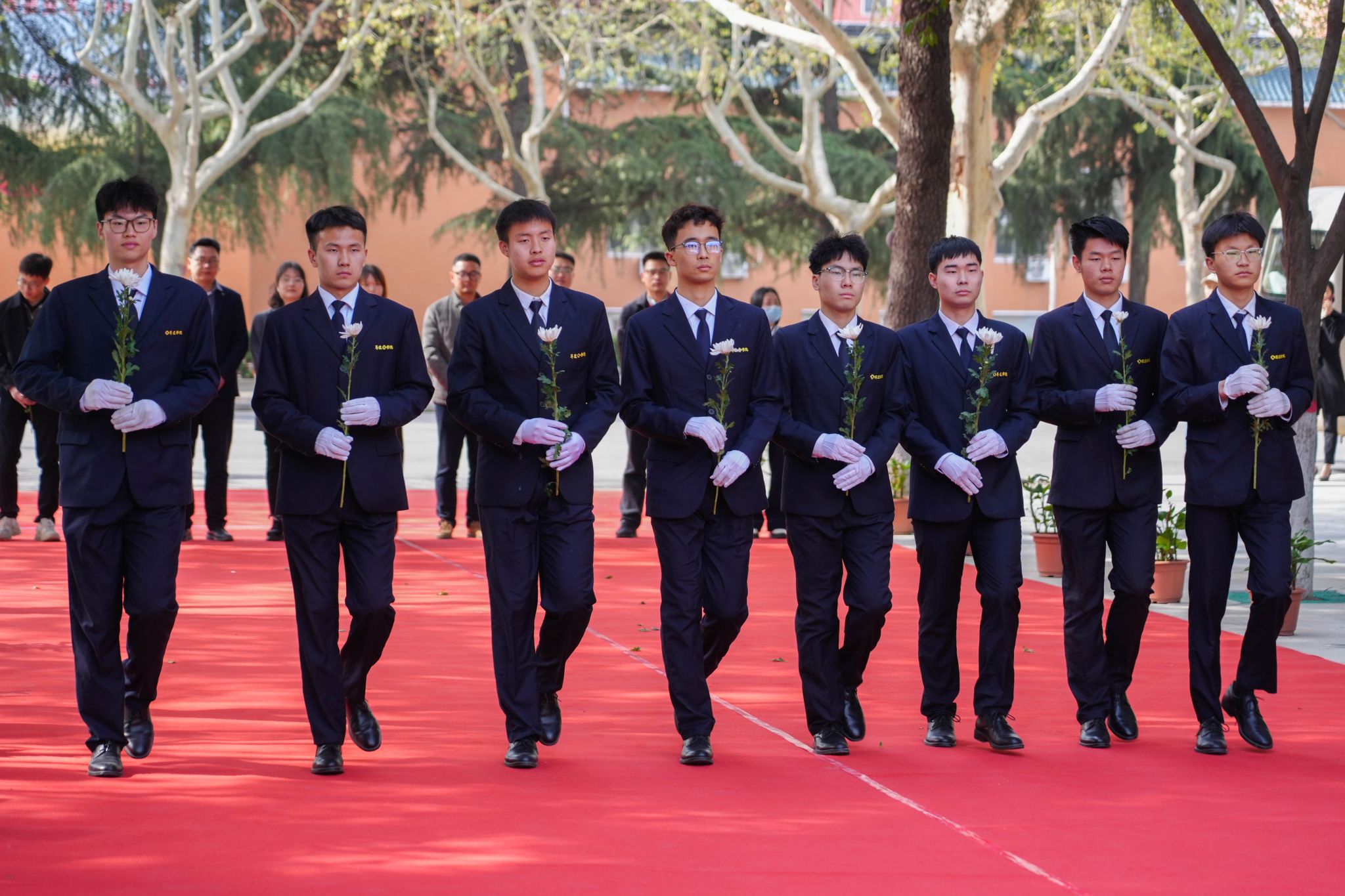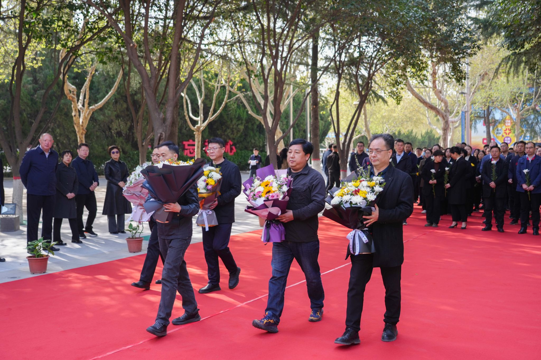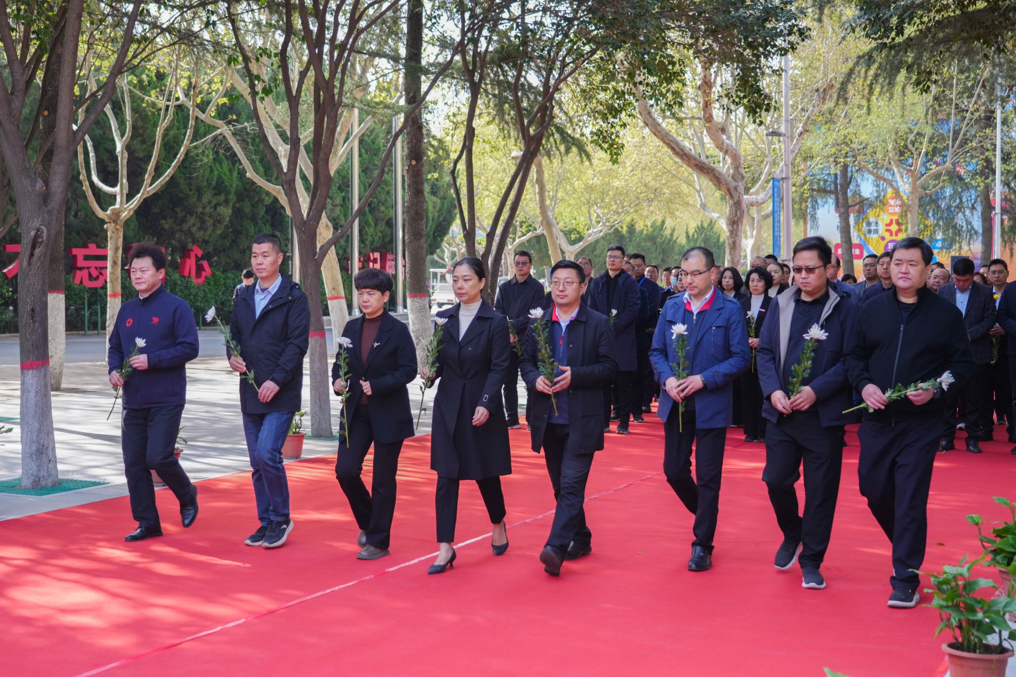 上午,纪念碑广场显得格外的安静、肃穆。参加献花仪式的全体人员穿着深色服装,手持白色或黄色菊花,排着整齐的队伍伫立在广场上。