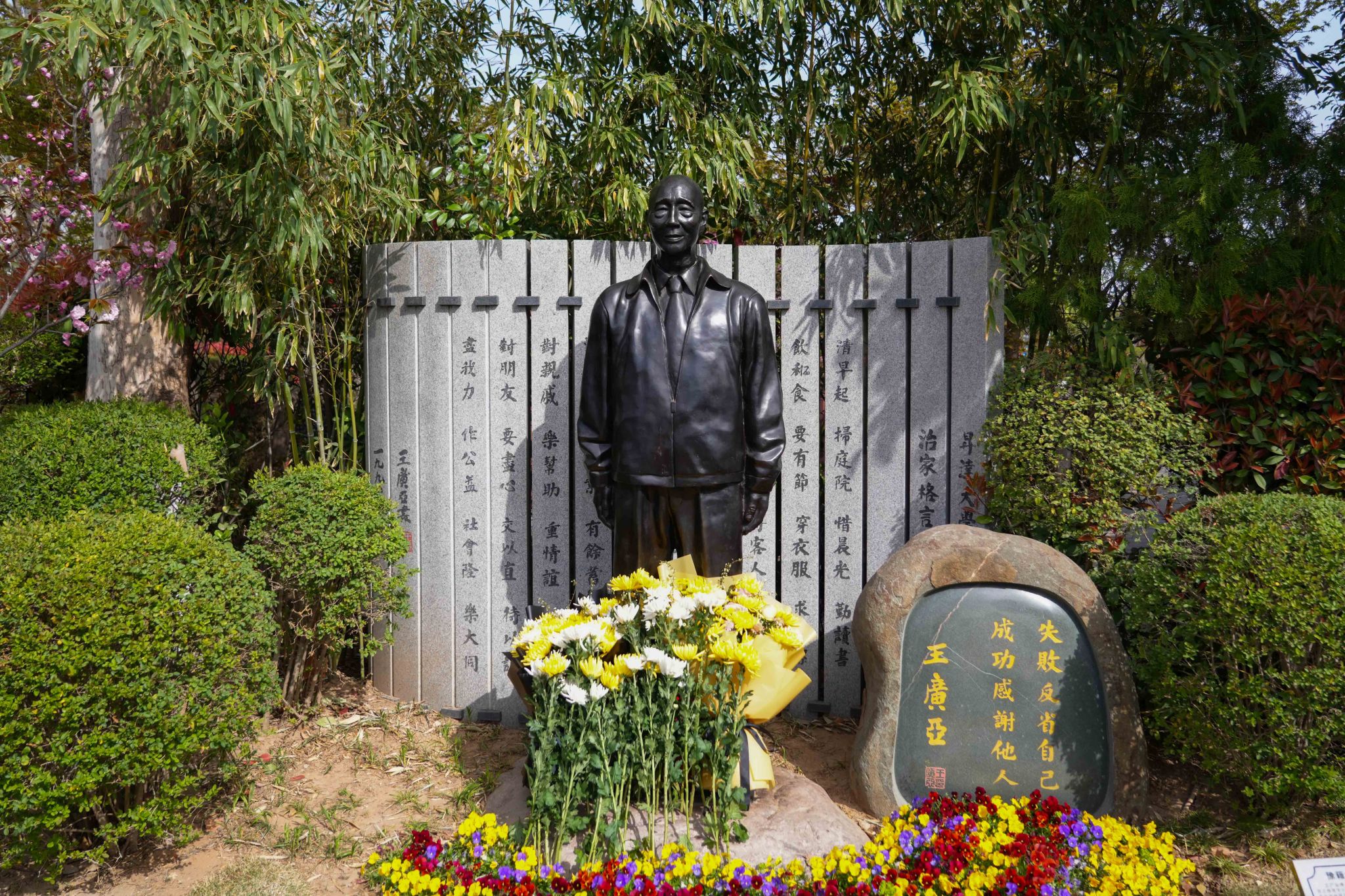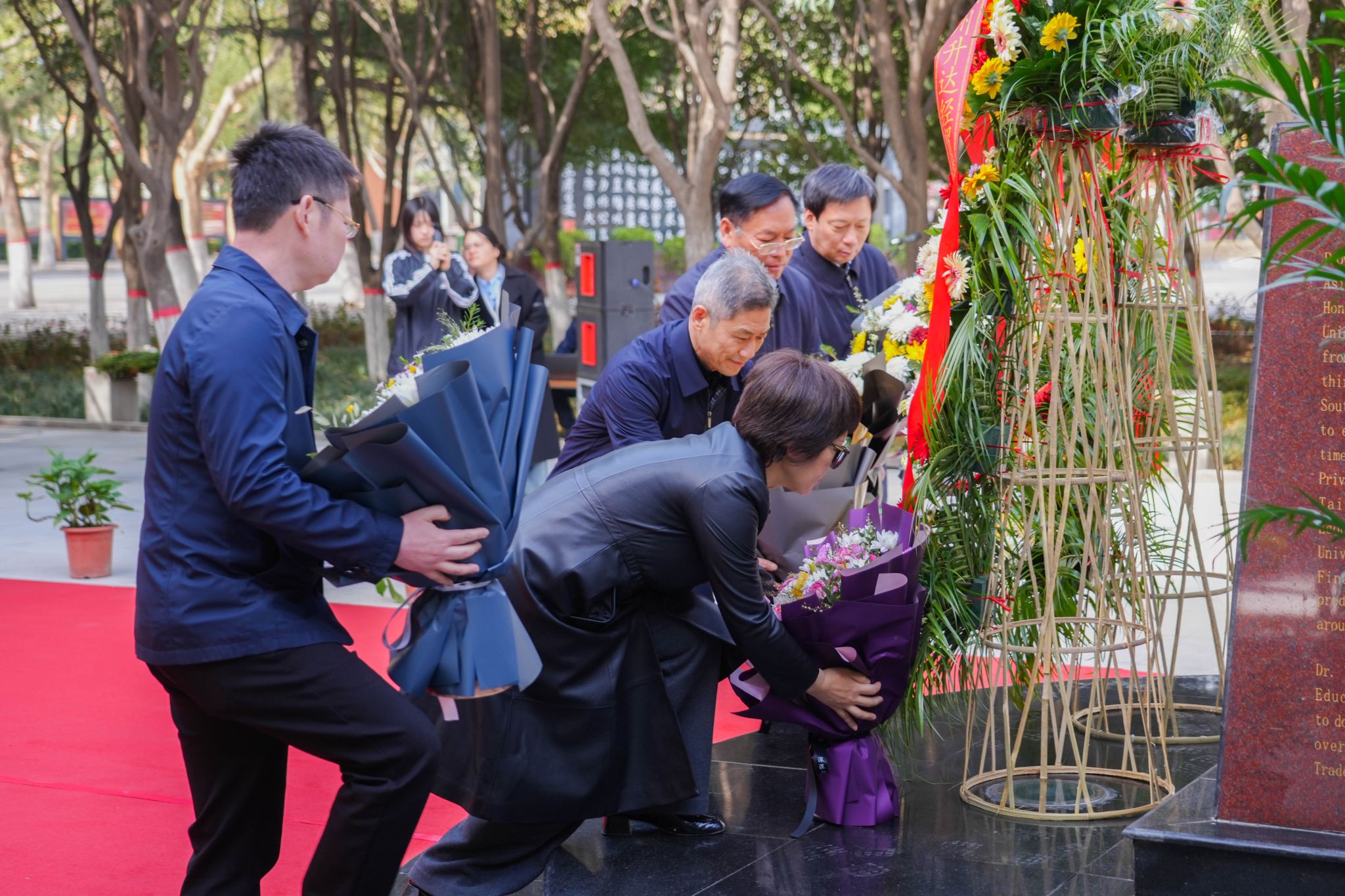 9时,献花仪式正式开始。在校领导的带领下,大家先向创办人王广亚博士铜像默哀,又恭恭敬敬地三鞠躬,表达对创办人的深切怀念之情。