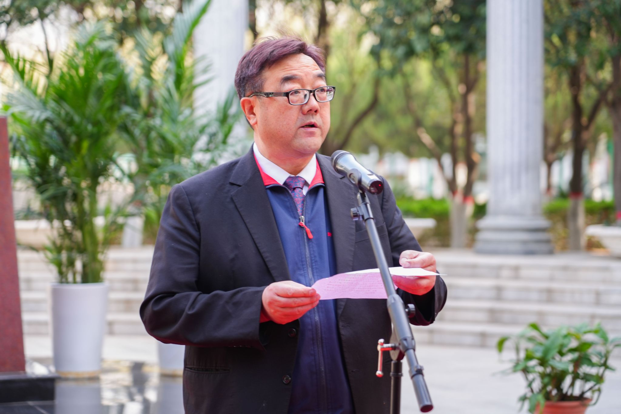 董事长王新奇表达了对创办人的深切怀念并郑重致辞,他讲述了创办人光辉和奉献的一生。王新奇表示,创办人虽然离我们远去了,但他的不朽功绩将被一代代永远铭记,他的奉献精神将被一代代永远传承,他的高风亮节将被一代代永远传颂,他开创的教育事业将被一代代永远光大,他是我们永远学习的杏坛楷模。建校32年了,昨天正式审核评估已经启动,让我们凝心聚力做好本职工作,让我们锐意创新把学校办得越来越好,以优异的办学成绩告慰创办人的在天之灵。