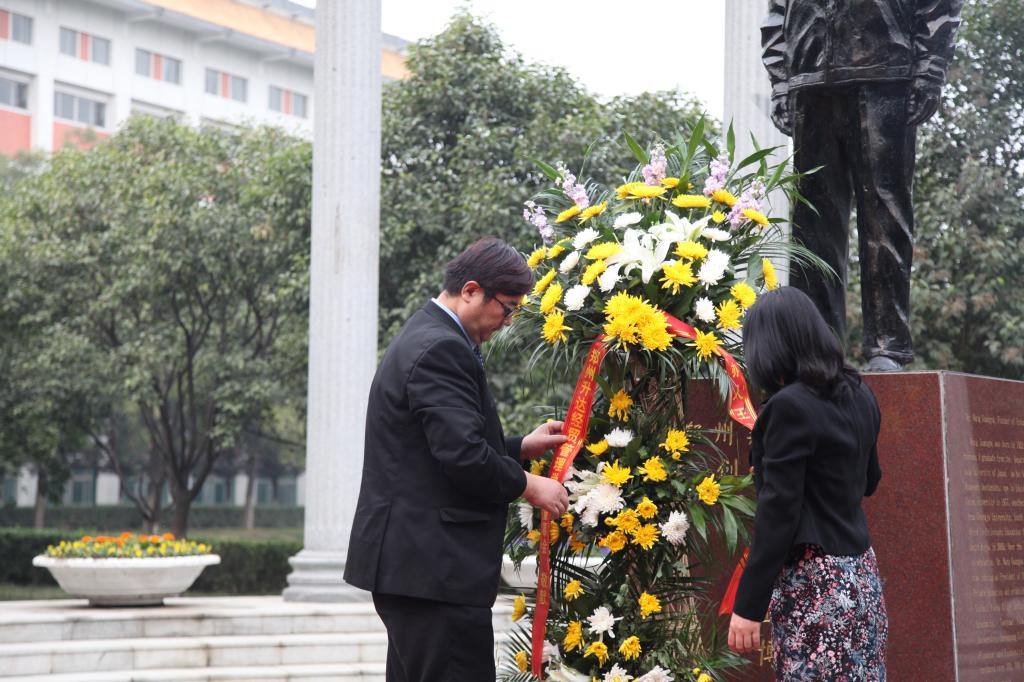 张其武处长、张雯静同学代表全校师生敬献花篮并整理花篮缎带;