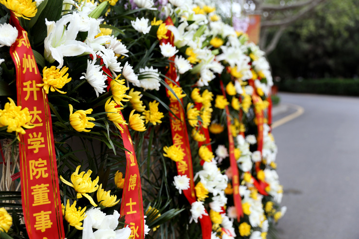 敬献鲜花仪式开始,首先,参加活动的全体人员向创办人王广亚博士默哀、行三鞠躬礼。接着,活动进入向创办人纪念像敬献鲜花环节:王新奇执行董事代表董事会敬献了花篮;郭爱先校长、张德伟书记代表学校党委和行政敬献了花篮;沈定军处长、钟江鸽书记代表学院全体教职工敬献了花篮;田书任、马梦萍同学代表学校全体在校生敬献了花篮。敬献了花篮之后,他们又怀着悲伤与崇敬的心情,细心地整理了花篮缎带。随后,院领导崔慕岳常务副校长、戎庭银副书记、张洁副校长、张金安副校长、吴益民副校长,向创办人敬献了鲜花花束。参加活动的师生代表依次向创办人敬献了鲜花。