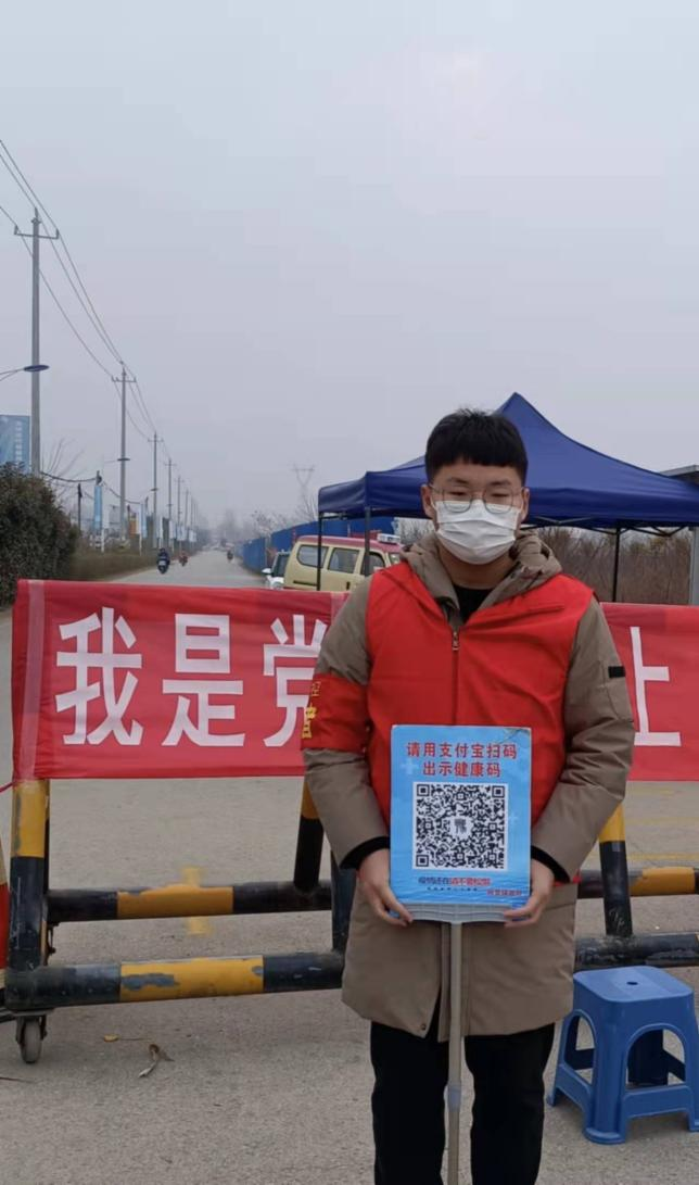 闫云鹏,21级建筑学本科1班学生。临近春节,新冠肺炎疫情又一次在河南各地爆发。在这个关键时刻,闫云鹏报名参加新乡县七里营镇余庄村的防疫志愿活动。他主要负责核查进出村车辆,查看健康码以及行程码,测量体温并登记行程信息。若有跨省返乡人员要求出示核酸检测报告,告其回家需要自主隔离,隔离期间,无故不得外出。闫云鹏认为:参加疫情防控志愿者活动不仅仅是一份工作,更是一份荣誉。只有大家都贡献出自己的力量,我们终将会战胜这场疫情。