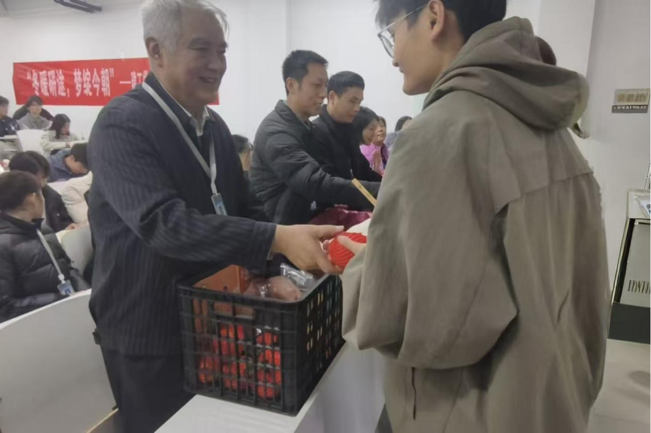 活动在播放精心制作的考研祝福视频中拉开帷幕。视频中,学院领导、老师与学弟学妹们一起为考研学生送上真挚祝福,为备考路上的学子们注入了别样的动力。活动现场,学院领导、老师为考研学生发放带有“上岸”字样的书签、一“研为定”文创帆布袋、寓意平安上岸的苹果、心想事成的橙子、妙笔生花的中性笔,还为学生准备了考研最后冲刺资料。