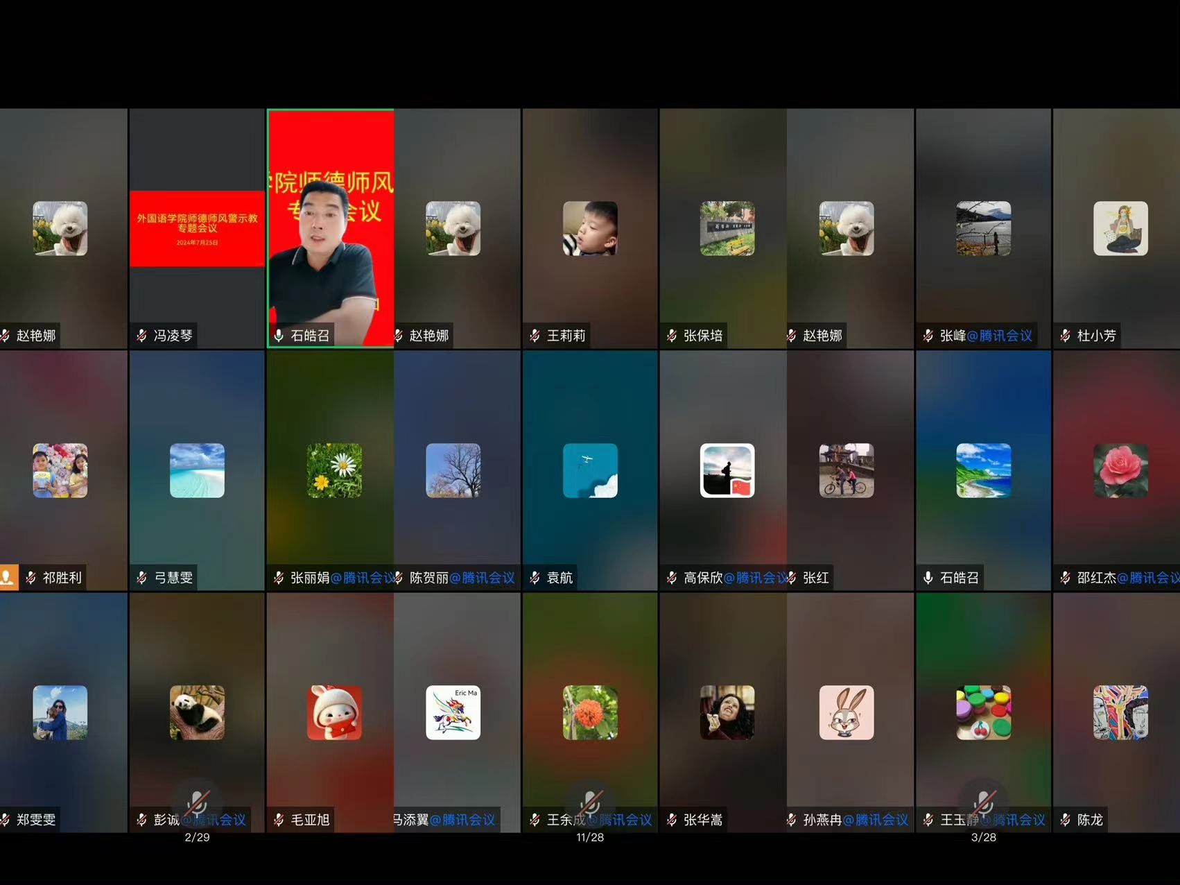 按照学校教师工作部工作部署,外国语学院于2024年7月25日下午6时,通过腾讯会议平台召开了“外国语学院师德师风警示教育专题会议”。此次会议由外国语学院党委书记石皓召同志主持,王莉莉院长及学院全体教职工参加了此次会议。