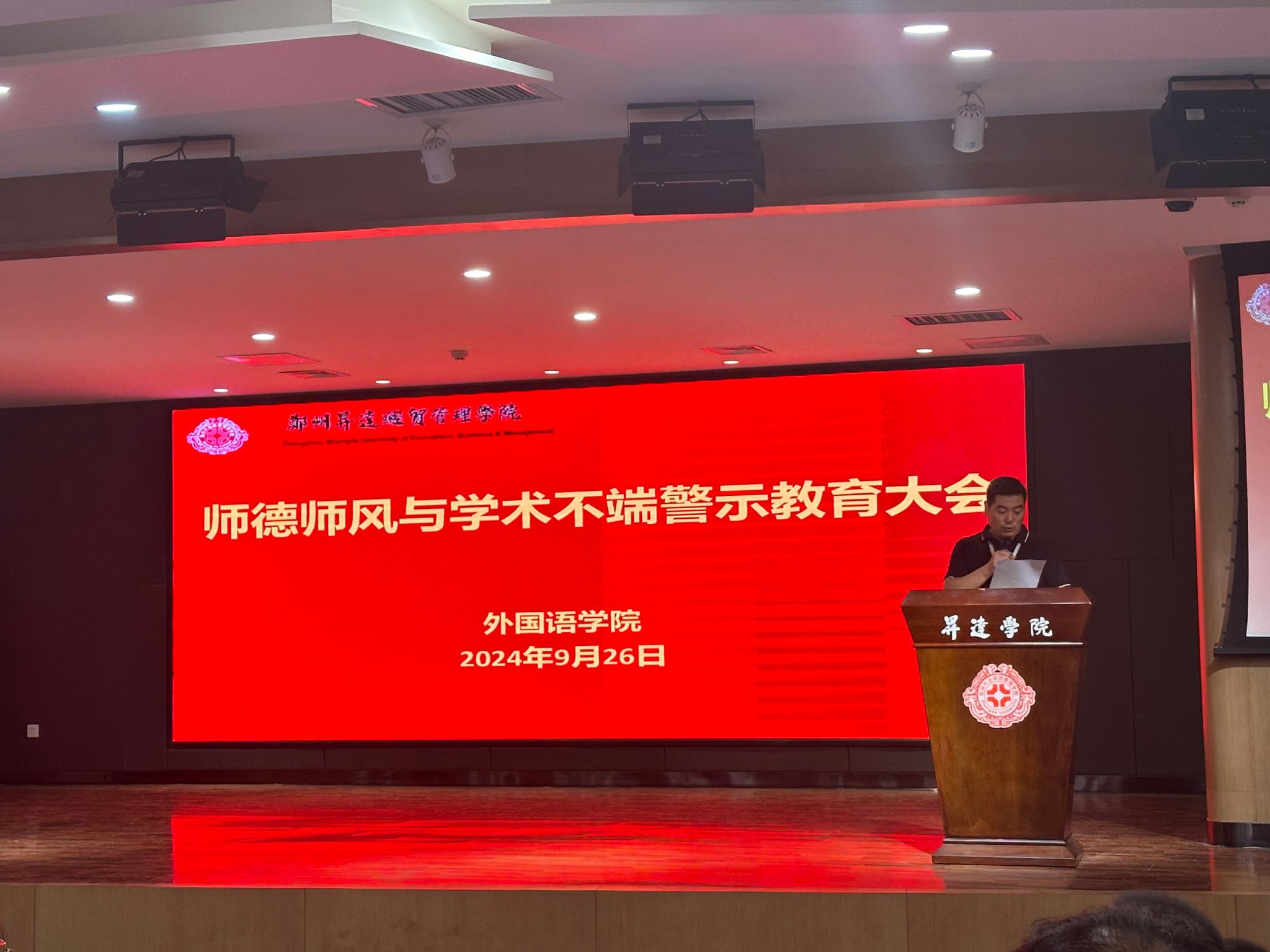 2024年9月26日,外国语学院在双创大讲堂召开了“师德师风与学术不端警示教育大会”。会议由党委书记石皓召主持,学院全体教职员参加会议。会议旨在强化师德师风建设,提升教职工对师德师风及学术诚信的认识。