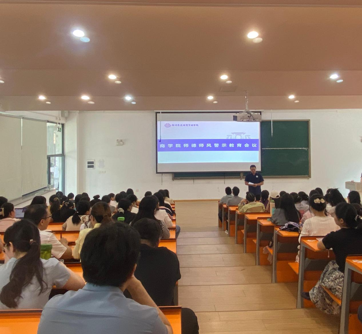 为深入贯彻落实新时代教师队伍建设要求,弘扬高尚师德师风,提升教师职业素养,商学院于5月29日下午14点在教学2号楼116教室召开师德师风警示教育活动。院长白朋飞、党委书记郭峰、教学秘书马巧丽、行政秘书郗艳花以及全体教职工参加会议。