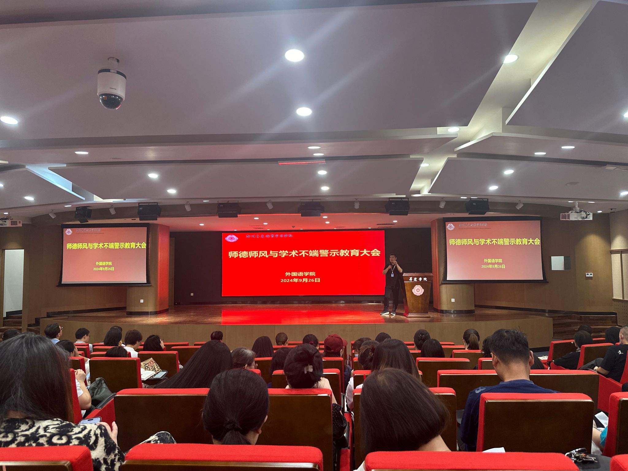 2024年9月26日,外国语学院在双创大讲堂召开了“师德师风与学术不端警示教育大会”。会议由党委书记石皓召主持,学院全体教职员参加会议。会议旨在强化师德师风建设,提升教职工对师德师风及学术诚信的认识。会...[详细]