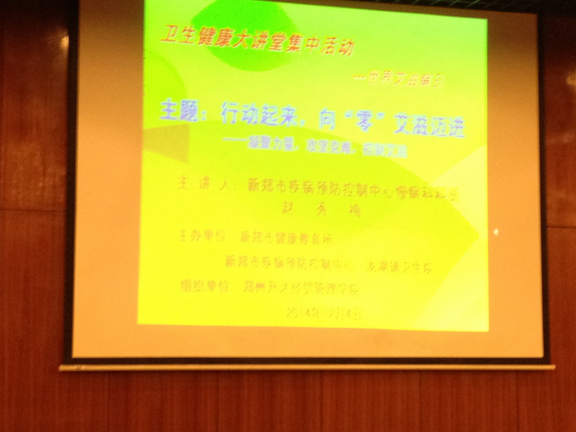 2014年12月4日14:30分,健康中心邀请新郑市疾病预防控制中心赵秀梅主任,在学院外语楼二层报告厅,举办了“防艾知识、倡导健康生活方式专题讲座”,学院近300名师生参加聆听讲座。