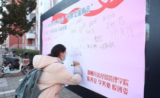 今年12月1日,是第34个“世界艾滋病日”,日前,教育办公厅及河南省教育厅发通知,要求各高校开展形式多样的艾滋病防治宣传教育活动。在新郑市疾控中心艾防办的大力支持下,经前期的积极准备,12月1日上午9时,医务室与学务处、校团委联合举办的校园艾滋病防治宣传活动在升达医务室门前广场开展。“生命至上 终结艾滋 健康平等”的主题宣传条幅格外显眼,带有紅丝带的宣传展板及签名墙烘托出浓浓的防艾宣传气氛,特别是活动现场丰富的礼品,吸引着学生们的眼球。医务室医护人员及青协志愿者胸前佩戴红丝带在穿梭忙碌服务,学生们川流不息积极参与。本次活动有三个环节,一是发放防艾宣传教育资料及小礼品,二是有奖问答,医务人员现场讲解,学生们现场答题并取得雨伞、毛巾、环保布包、口罩、指甲刀等礼品。同学们积极踊跃参加,既能学习防艾知识,又能答题得奖,寓教于乐,热闹非凡。最后,学生们在红丝带的签名墙上潇洒的签上自己的名字,并留影纪念。活动参与师生500余人,发放宣传资料800余份,收到实名答卷150余份。发放各种礼品共计1000余份。