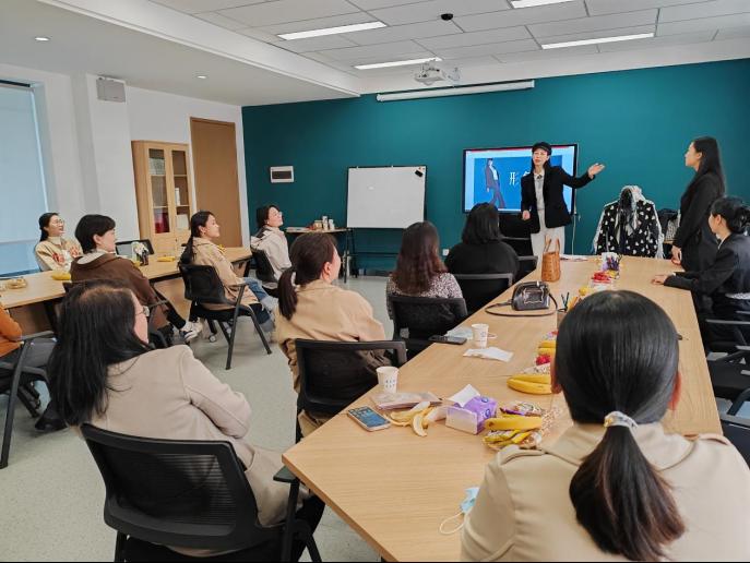 吴则斌副教授围绕教师形象设计,结合自身教学经验和前期调研结果,以“人物量感”为切入点,从概念引入、课堂互动、形象解析三个方面与在场教师进行了详细讲解交流和教具实践诊断。期间,她引导辨析“量感”触发兴趣点,并为在座教师逐一进行形象诊断分析,现场活动气氛热烈。最后,吴教授着重对不同量感人群穿搭的思路要求做了针对性指导。