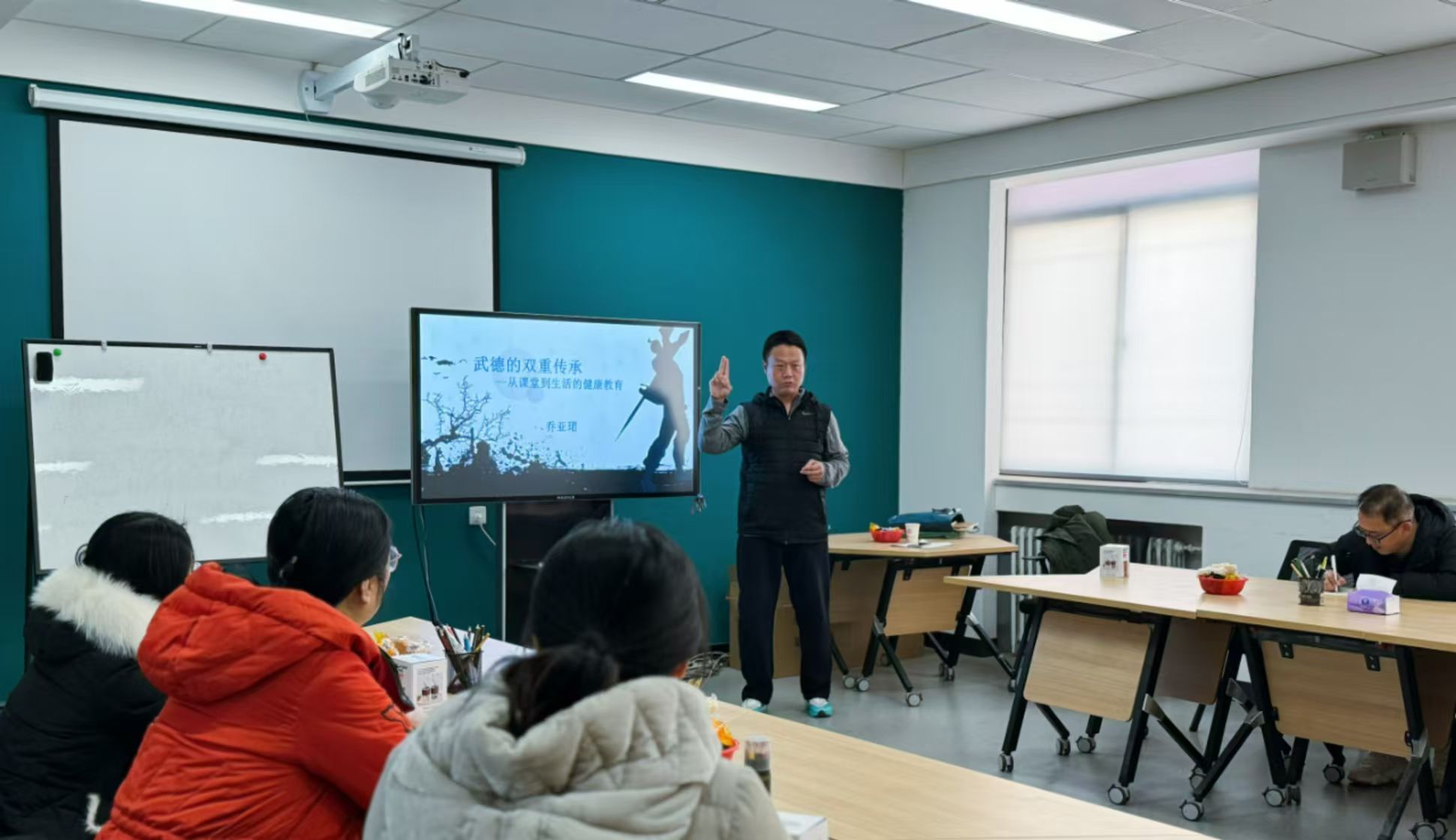 活动伊始,乔教授从“武德”概念的由来与内涵入手,讲解了武术不仅是一项体育运动,更是一种生活哲学,强调其对身心健康的全面影响。乔教授深入分析了武术文化中的“德”与“技”的双重传承,特别是如何将武术中的健康理念与现代教育理念相结合,促进教师们在日常生活中的身心平衡。