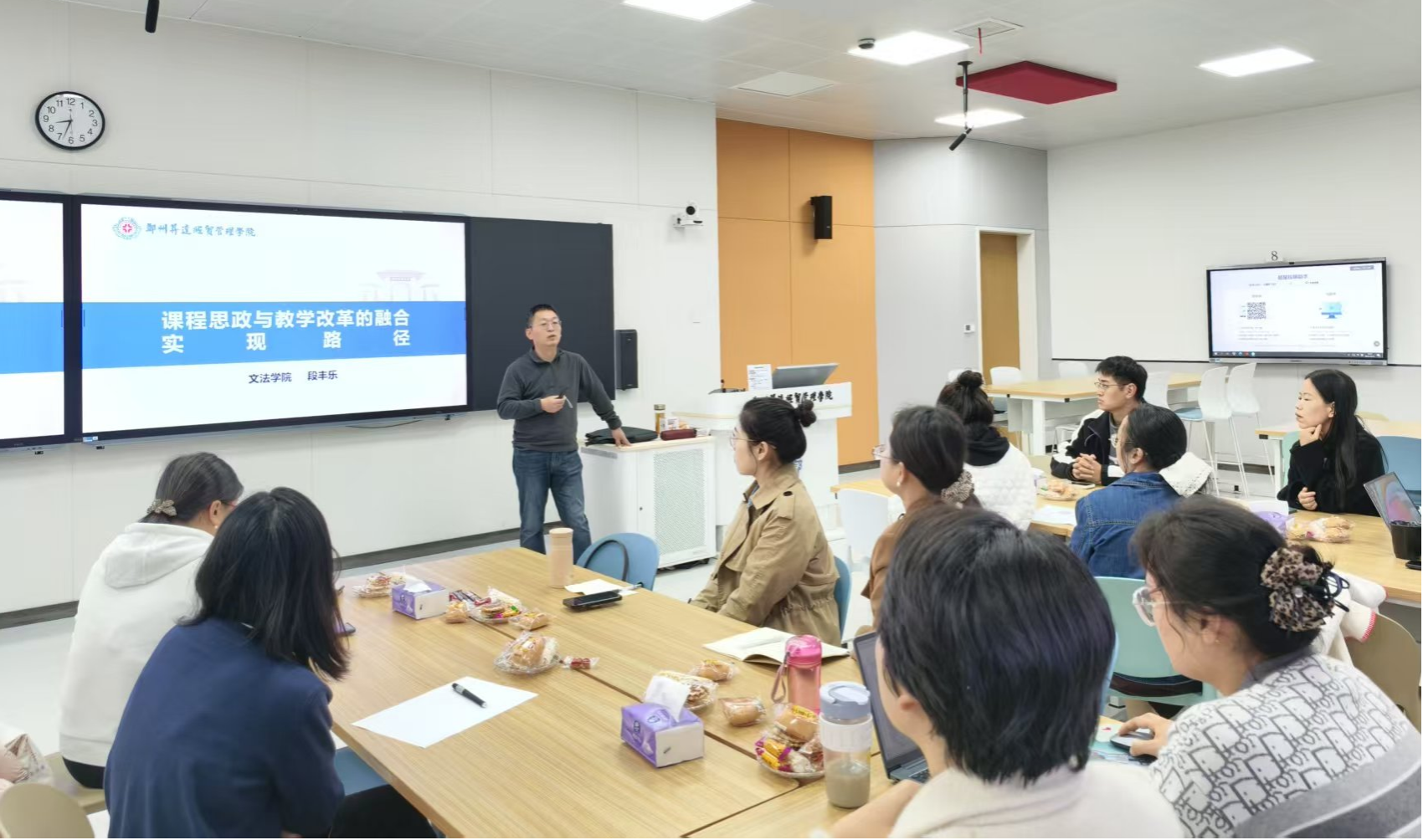 为帮助我校教师破解课程思政与教学改革融合的难题,搭建教师交流碰撞、共研共进的平台,10月17日,教师发展中心在道镕楼102智慧教室举办“课程思政与教学改革的融合路径”主题沙龙。活动由教师发展中心副主任郭青梅主持,校本培训师、文法学院院长段丰乐教授应邀主讲,各单位近20名教师报名参加。