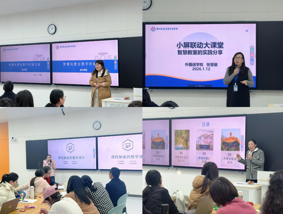 为切实推进智慧教室应用落地见效,充分发挥其在教学模式创新中的支撑作用,引导教师规范、高效运用智慧教室开展教学实践,2026年1月13日,教师发展中心联合实训与设备管理处在道镕楼117智慧教室举办“智慧教室教学经验交流”主题沙龙。活动由教师发展中心副主任郭青梅主持,各学院50余名教师参加。