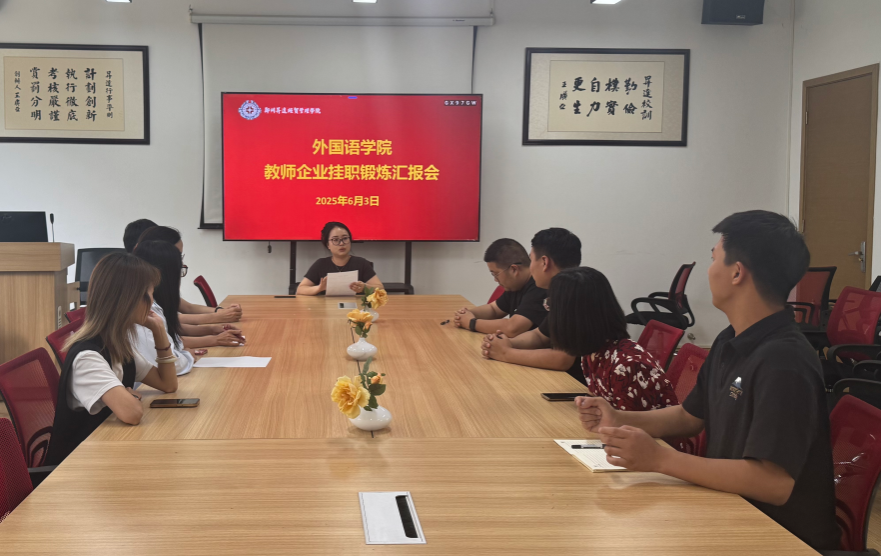 教师赴企业挂职锻炼,是深化产教融合、推动高校教学与行业实践紧密结合的重要举措,有助于教师将企业实践经验融入课堂,提升教学质量与专业素养。外国语学院于2025年6月3日下午在教学一号楼206会议室举办了第十批教师挂职锻炼汇报交流会。本次交流会由英语教研室郭真老师分享在郑州月晨教育咨询服务有限公司的挂职成果,引发了与会老师热烈讨论。
