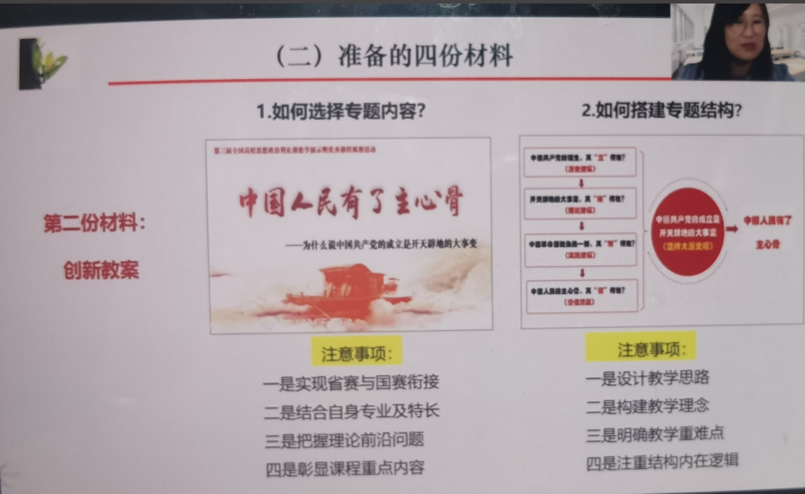 在为期两天的培训中,代晓雅老师聆听了河南理工大学马克思主义学院王家涛副教授;江西外语外贸职业学院马克思主义学院刘霞老师;大连民族大学马克思主义学院曾宁副教授的三场高质量讲座:《基于“PBL教学法”的思政课教学展示活动竞赛技巧》、《台上一分钟 台下十年功-全国高校思政课教学展示经验分享》、《宁静方能致远-“中国近现代史纲要”课参赛流程与备赛交流》。三位学者分别从精确认识竞赛、精心准备参赛资料、精彩呈现竞赛、实战案例解析等多个维度展开了深入的探讨和交流,为有效发挥教学竞赛的示范效应,激发教师积极投身思政课教学的热情,提升政治素养与业务能力提供了新思路和新方法。