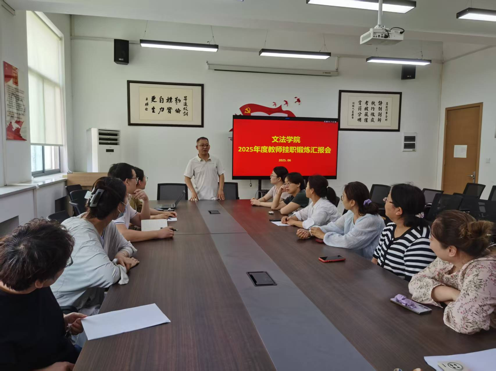 2025年6月27日,文法学院举行了2025年度教师挂职锻炼汇报会。法学教研室刘凡义老师向法学专业教师代表们做了《从课堂到法庭:一位劳动法教师的实务突围》的专题汇报,分享了他在北京中简(郑州)律师事务所为期一年的挂职锻炼心得。这场"带着问题去,揣着答案回"的实务之旅,不仅是一次教师专业能力的"充电",更成为学院推动"产教融合"的生动注脚。