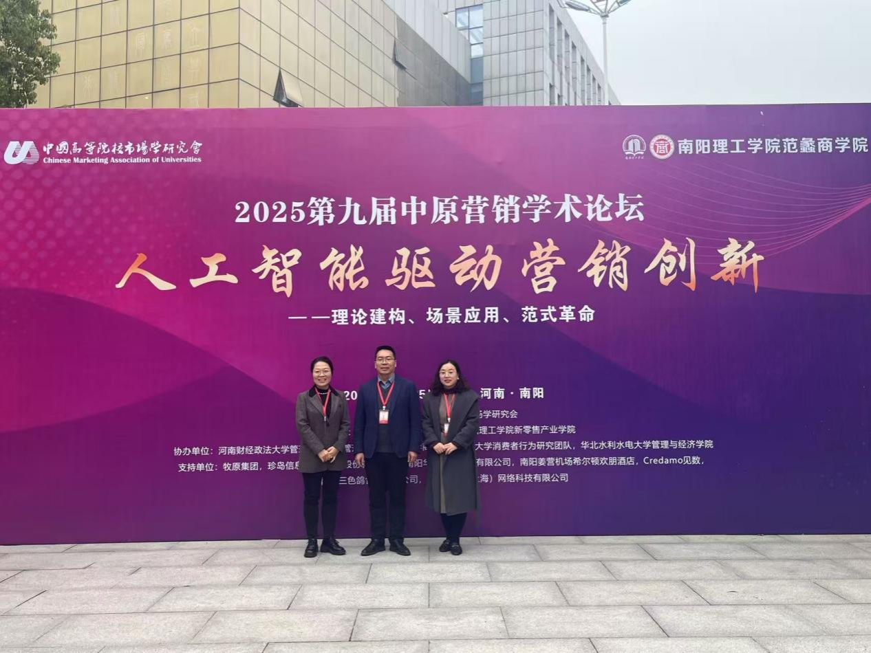 2025年10月25日至26日,以 “人工智能驱动营销创新 —— 理论建构、场景应用、范式革命” 为主题的第九届中原营销学术论坛在河南南阳成功举办。本次论坛由中国高等院校市场学研究会主办,南阳理工学院范蠡商学院承办,汇聚了国内外营销领域知名专家学者、高校代表及企业精英,围绕AI时代营销理论突破与实践变革展开深度研讨。商学院院长白朋飞教授、市场营销教研室主任霍秀珍老师、市场营销系教师王绘娟老师受邀参会,积极融入学术交流与思想碰撞,为学院市场营销学科发展汲取前沿养分。