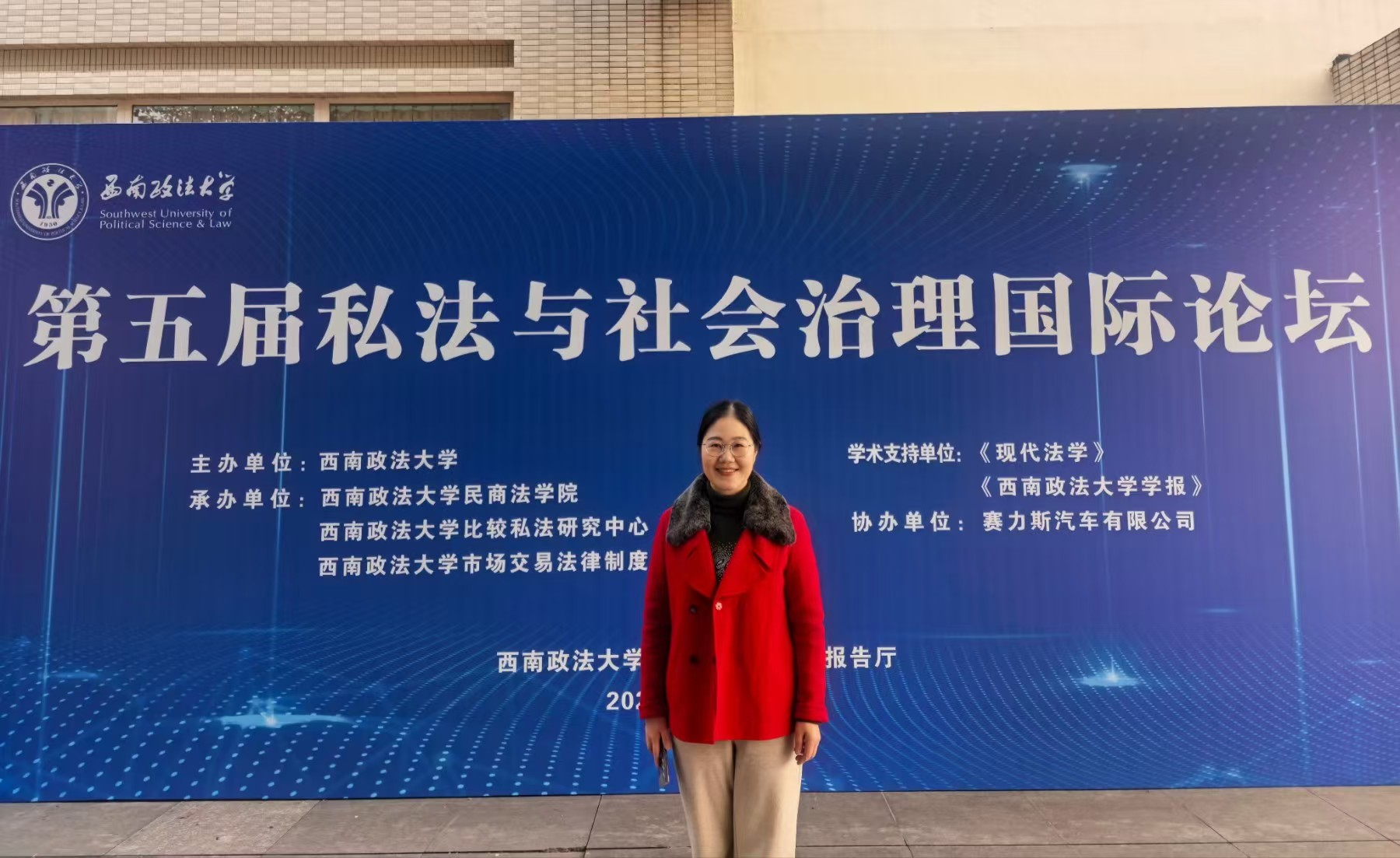 2025年11月30日,由西南政法大学主办,西南政法大学民商法学院等单位承办的第五届私法与社会治理国际论坛在西南政法大学毓才楼一楼学术报告厅成功举行。我校文法学院副教授徐静应邀出席此次学术盛会,与来自俄罗斯、韩国、日本等国内外多所知名高校、研究机构的专家学者,共同围绕“新科技革命下的民商法转型”与“比较法视野下的民商法转型”两大核心议题展开研讨。