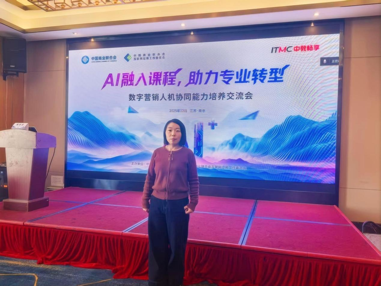 为积极响应国家“人工智能+”行动战略,推动数字营销领域人机协同教学创新,12月6日-7日,由中国商业联合会主办、互联网应用工作委员会承办的“数字营销人机协同能力培养交流会”在南京举办。商学院选派跨境电商专业教师郭文雅参会,与来自全国多所高校的院系负责人、专业教师共同围绕AI赋能专业建设、课程转型与人才培养展开深入交流。