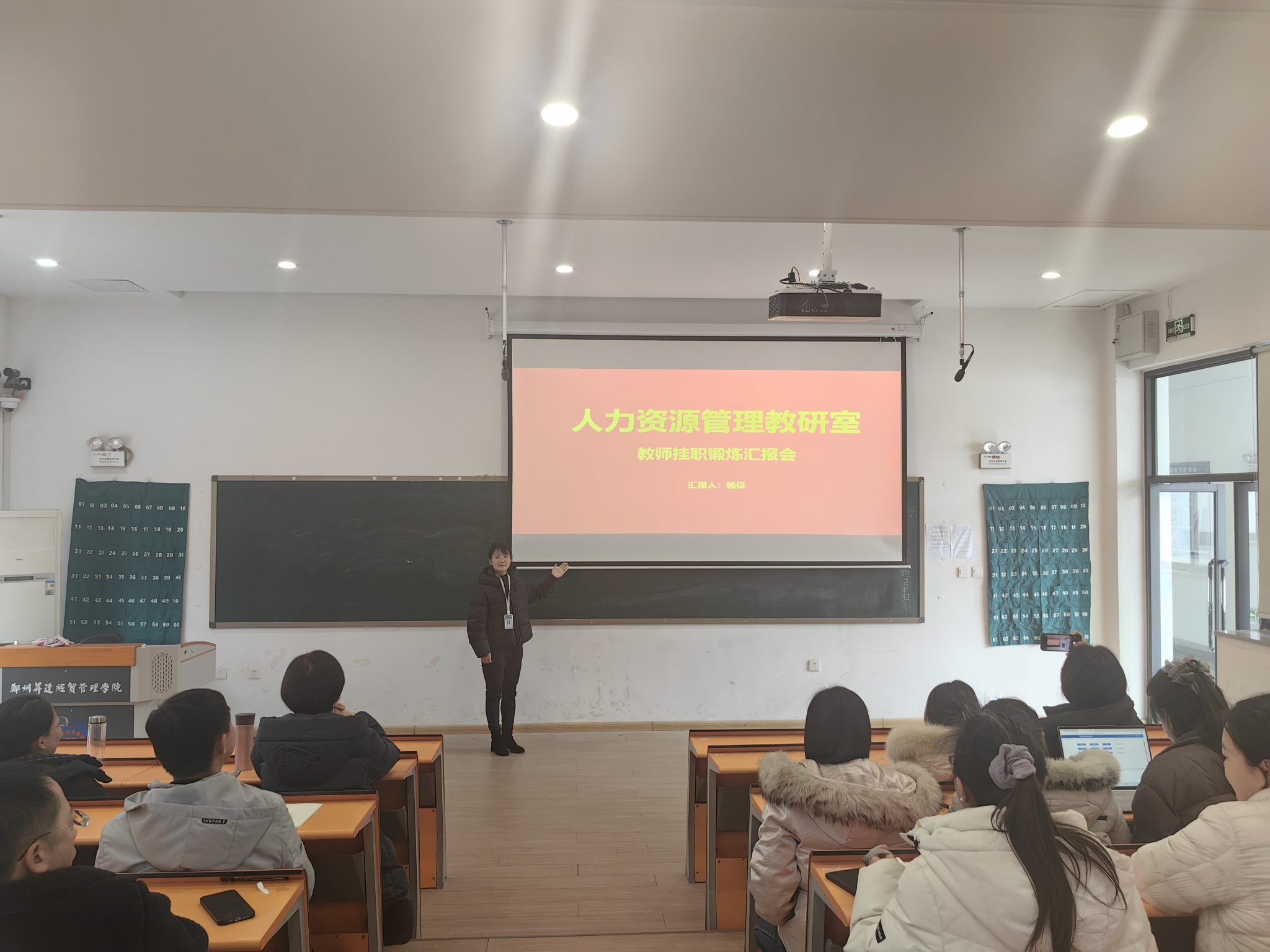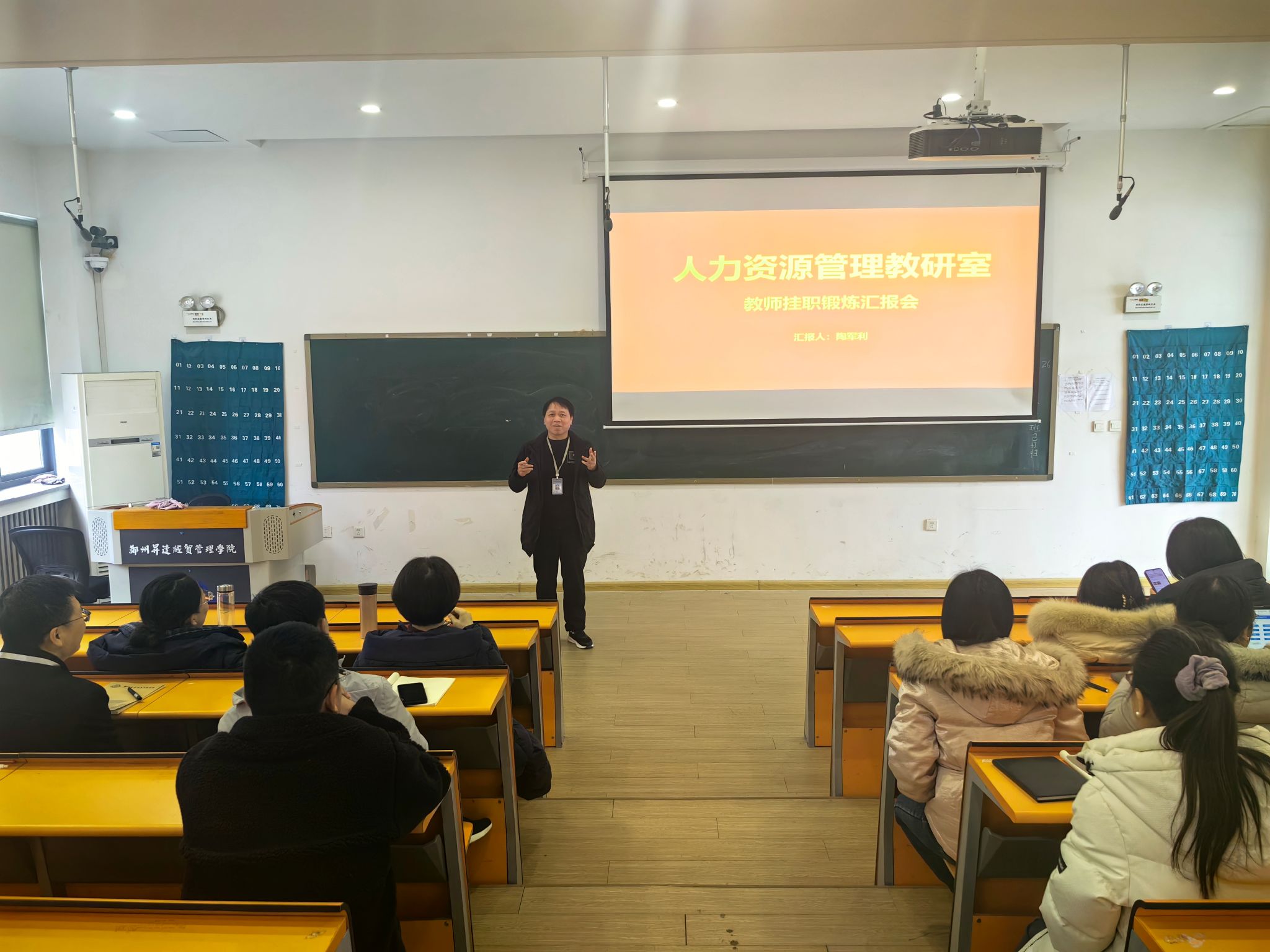 为促进理论教学与产业需求精准对接,加速高校“双师型”教师队伍建设。自2025年1月以来,我校管理学院人力资源管理教研室杨征、陶军利两位教师圆满完成了分别赴河南豫教物联技术有限公司与河南水木豫农现代农业科技有限公司的挂职锻炼。两位教师以专业顾问身份,将理论知识应用于企业实践场景,取得了一系列成效。为总结与推广经验,人力资源管理教研室于2026年3月6日在教学2号楼组织了挂职锻炼汇报会。