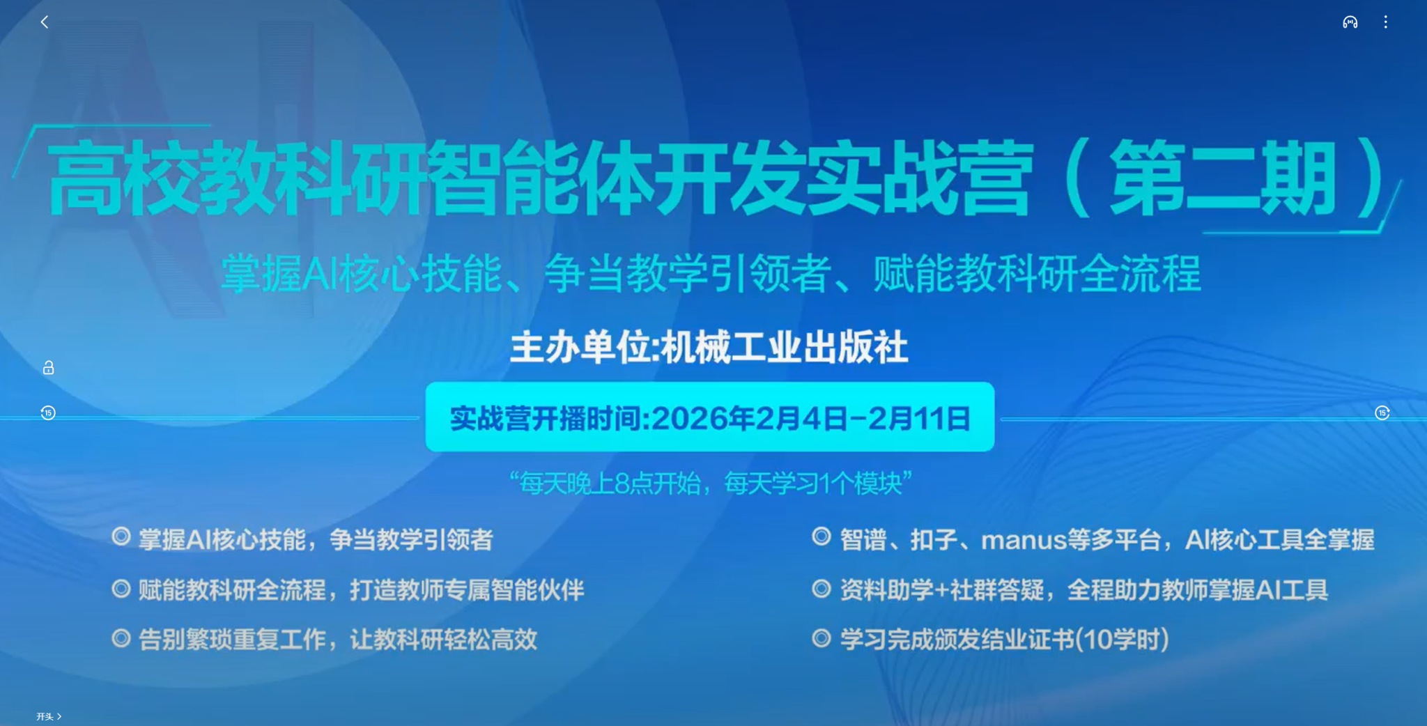 为积极响应教育数字化转型号召,提升教师运用人工智能技术赋能教学科研的能力,信息工程学院于2026年2月4日至11日寒假期间,参加了由机械工业出版社举办的“高校教科研智能体开发实战营”线上培训班。本次培训由学院张娟主任和王春丽老师共同参加,旨在通过前沿智能体技术的系统学习,帮助教师更高效地开展高校教学与科研工作。