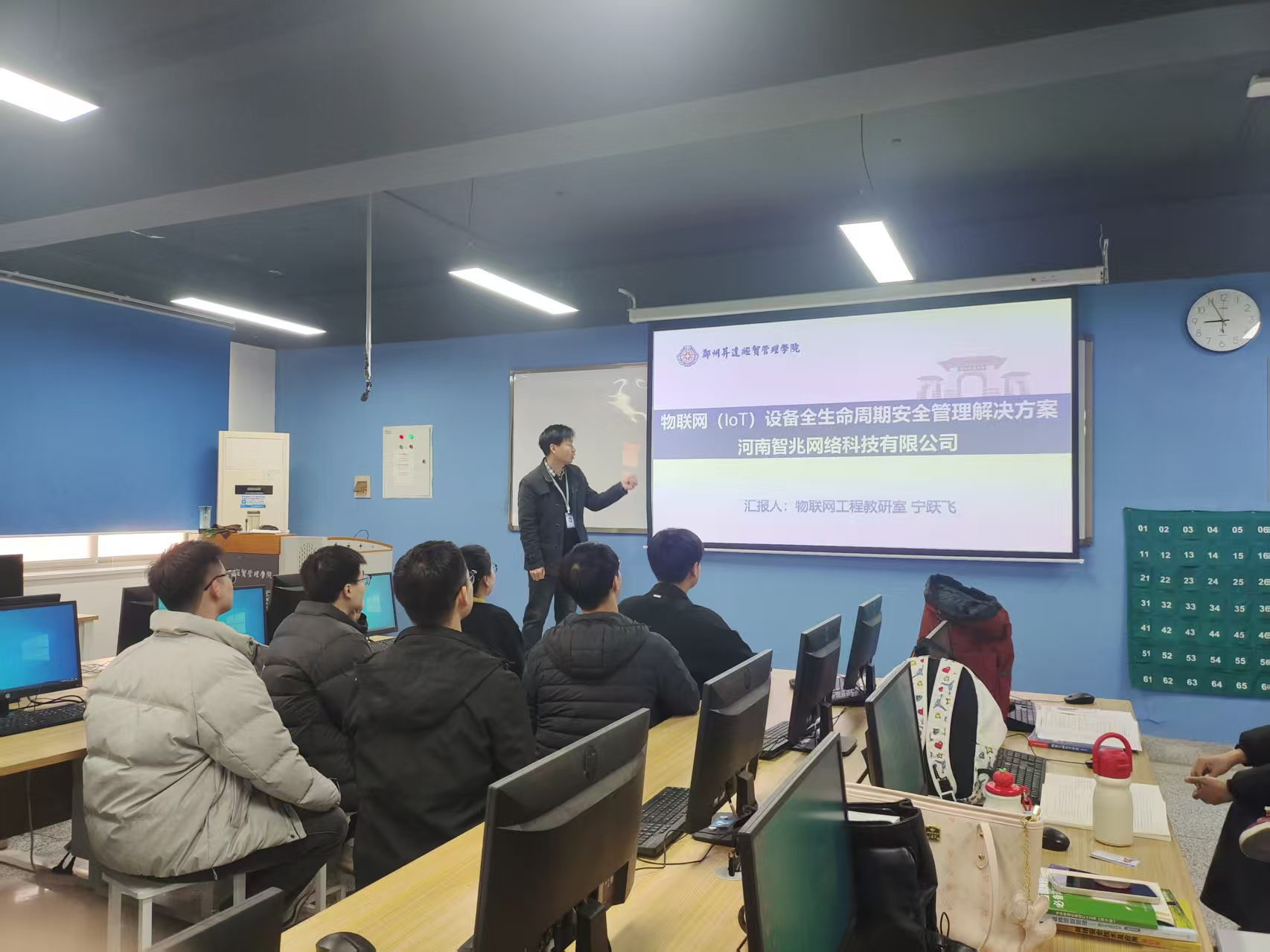 会上,宁跃飞老师分享了在河南智兆网络科技有限公司的挂职经历。他的挂职工作聚焦物联网设备全生命周期安全管理领域,紧扣企业业务发展实际需求扎实推进。宁老师从挂职锻炼核心内容、收获与能力提升、实践成果总结三个维度,系统梳理并汇报了挂职期间的工作推进情况与实际成效。他表示,此次挂职是一次宝贵的学习成长机遇,在AI快速发展的背景下,通过深度参与物联网设备全生命周期安全管理相关企业项目,进一步深化了对AI赋能物联网安全技术研发与管理应用的理解,有效实现了专业知识的更新迭代与工程实践能力的提升。同时,他强调,挂职经历让自己清晰认识到当前教学内容、模式与物联网行业实际需求间的差距,也为后续优化专业课程体系、创新实践教学模式指明了明确方向。
