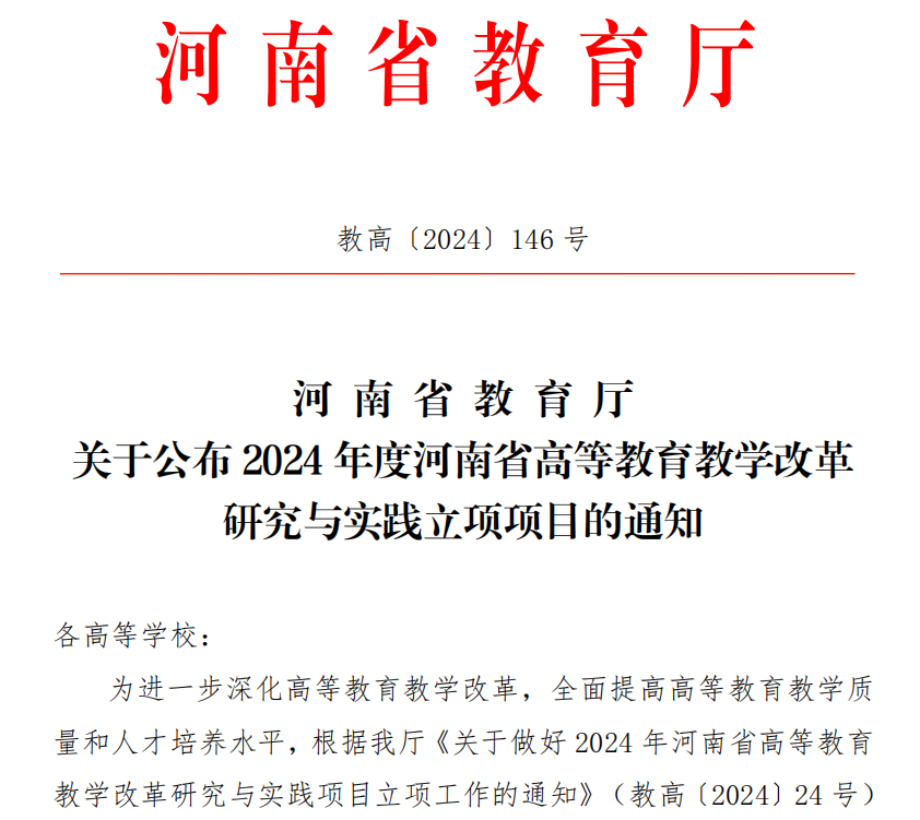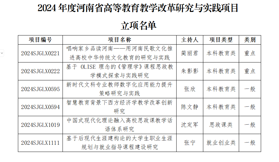 近日,河南省教育厅公布了2024年度河南省高等教育教学改革研究与实践项目立项名单,我校6个项目获批省级立项。其中,本科教育类4项,思政课类1项,就业创业类1项。