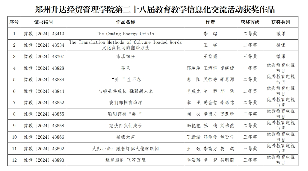 近日,河南省教育厅印发了《河南省教育厅关于公布河南省第二十八届教育教学信息化交流活动评选结果的通知》(教资保函〔2024〕343号)文件,我校共有12项作品获奖,其中一等奖1项、二等奖7项、三等奖4项。获奖名单如下: