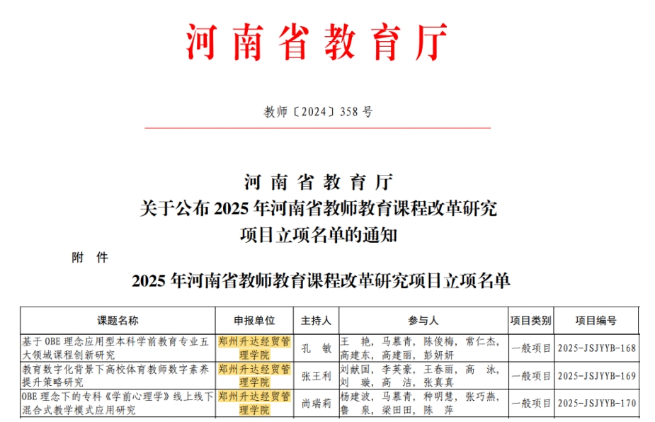 近日,河南省教育厅发布《关于公布2025年河南省教师教育课程改革研究项目立项名单的通知》(教师〔2024〕358号),我校申报的3个项目全部获批立项。分别是孔敏主持的《基于OBE理念应用型本科学前教育专业五大领域课程创新研究》、张王利主持的《教育数字化背景下高校体育教师数字素养提升策略研究》以及尚瑞莉主持的《OBE 理念下的专科〈学前心理学〉线上线下混合式教学模式应用研究》均获批一般项目。