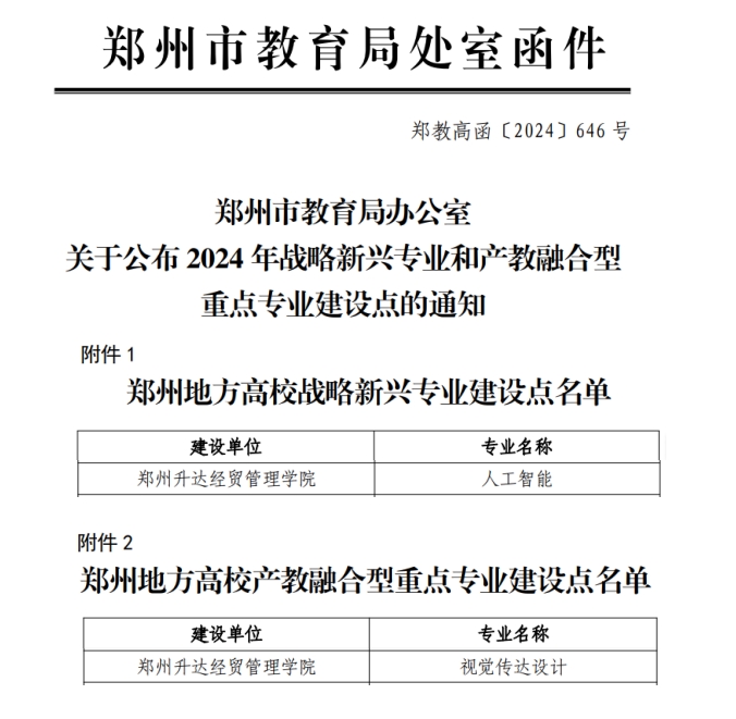 近日,郑州市教育局办公室发布了《关于公布2024年战略新兴专业和产教融合型重点专业建设点的通知》(郑教高函〔2024〕646号),我校“人工智能”专业荣获郑州地方高校战略新兴专业建设点,“视觉传达设计”专业荣获郑州地方高校产教融合型重点专业建设点。