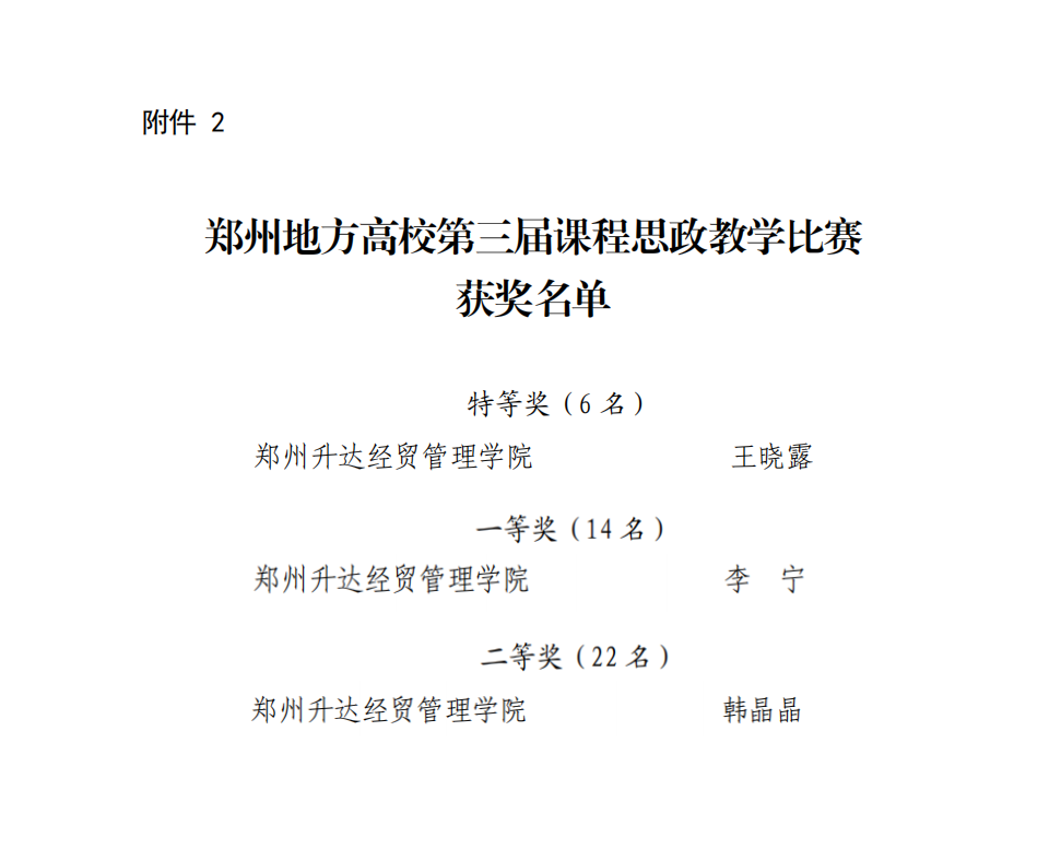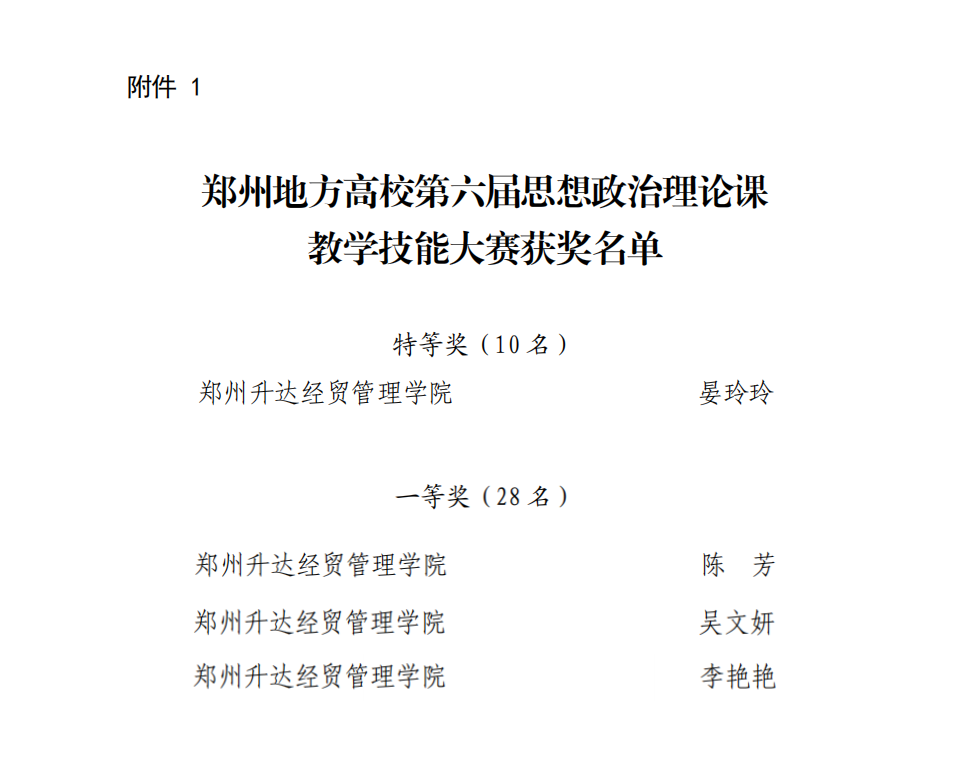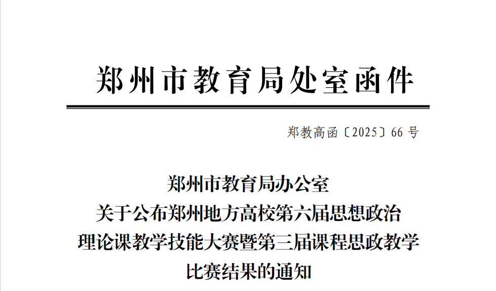 近日,郑州市教育局发布了《关于公布郑州地方高校第六届思想政治理论课教学技能大赛暨第三届课程思政教学比赛结果的通知》(郑教高函〔2025〕66 号),在郑州地方高校第六届思想政治理论课教学技能大赛中,我校马克思主义学院晏玲玲老师荣获特等奖、马克思主义学院陈芳、吴文妍、李艳艳三位老师荣获一等奖;在郑州地方高校第三届课程思政教学比赛中,我校艺术学院王晓露、数学与信息科学学院李宁、建筑工程学院韩晶晶分别荣获特等奖、一等奖和二等奖。