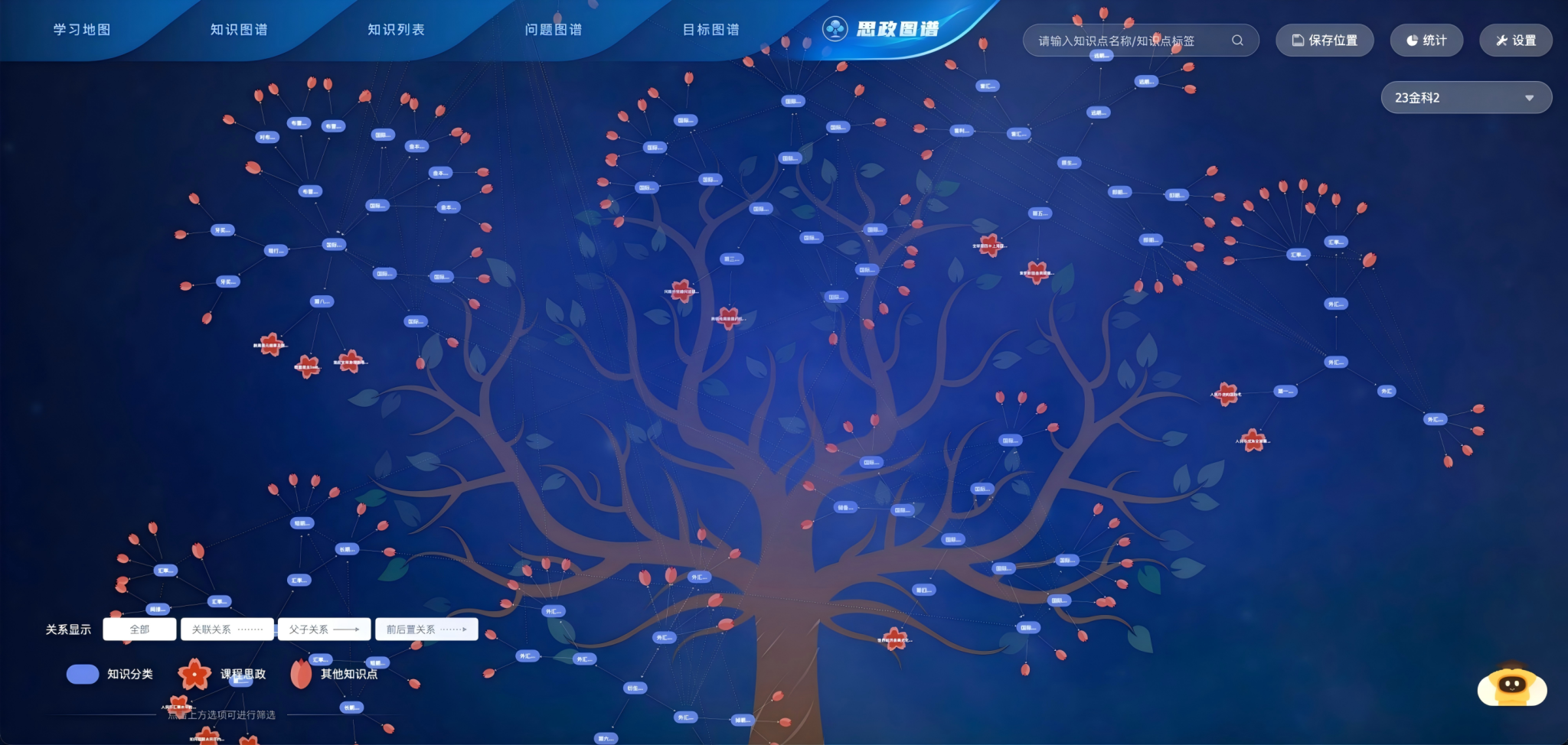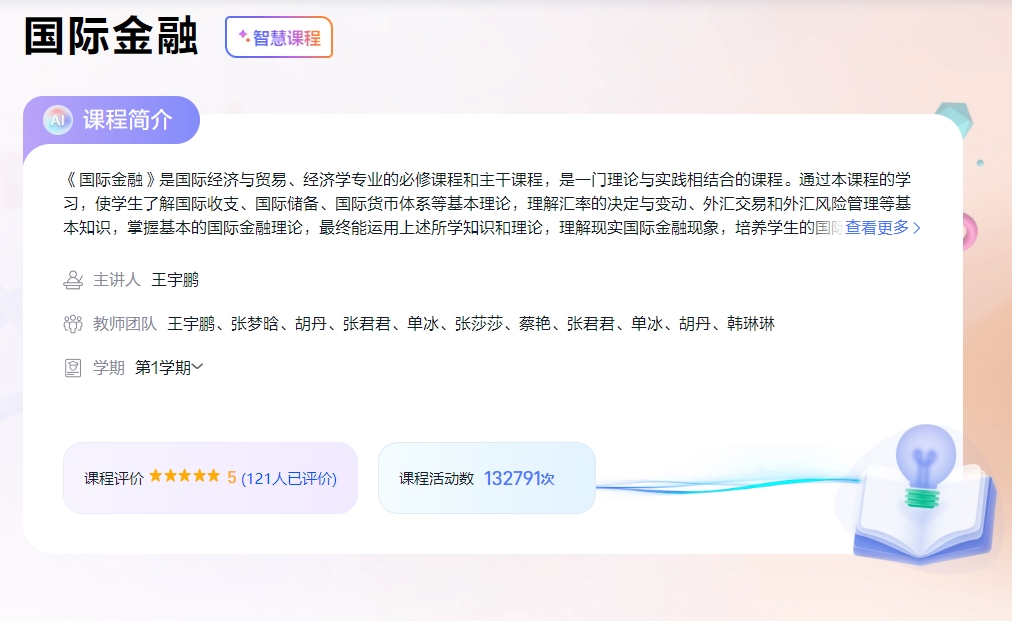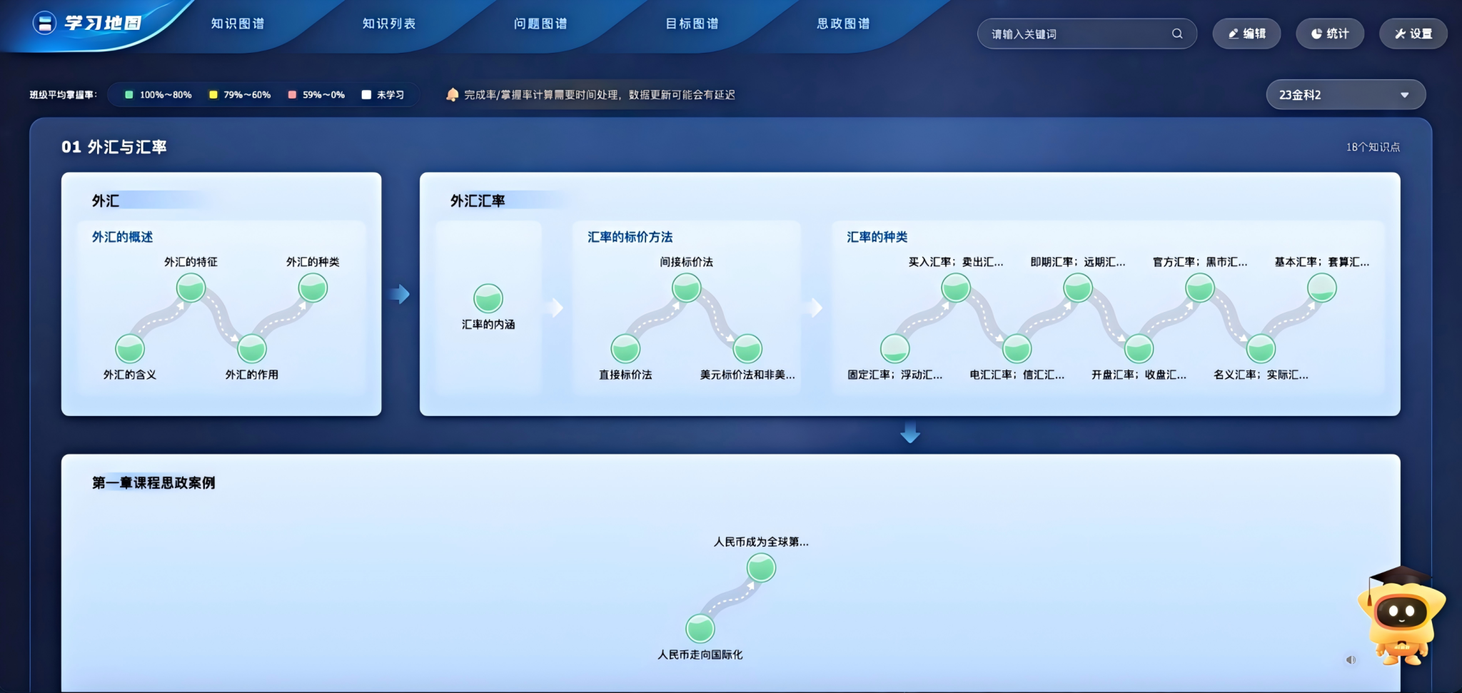 《国际金融》课程已在超星平台上线,通过AI技术与教学场景的深度融合,构建了“智能分析-精准教学-个性服务-效果评估”的全流程智慧教学模式,为金融类课程的数字化转型提供了创新范例。课程运用AI学情分析系统实时监测课程运行数据,形成“备课-资源-学情”的智能闭环,创新性地开发了多维度知识图谱,包括课程知识图谱、问题图谱、目标图谱及课程思政图谱,以可视化方式呈现知识网络与育人逻辑,其中思政图谱以“思政树”形式实现价值引领。