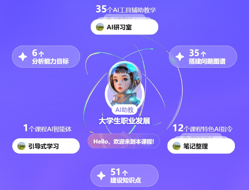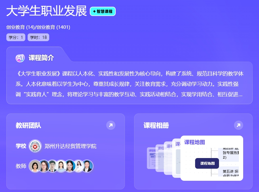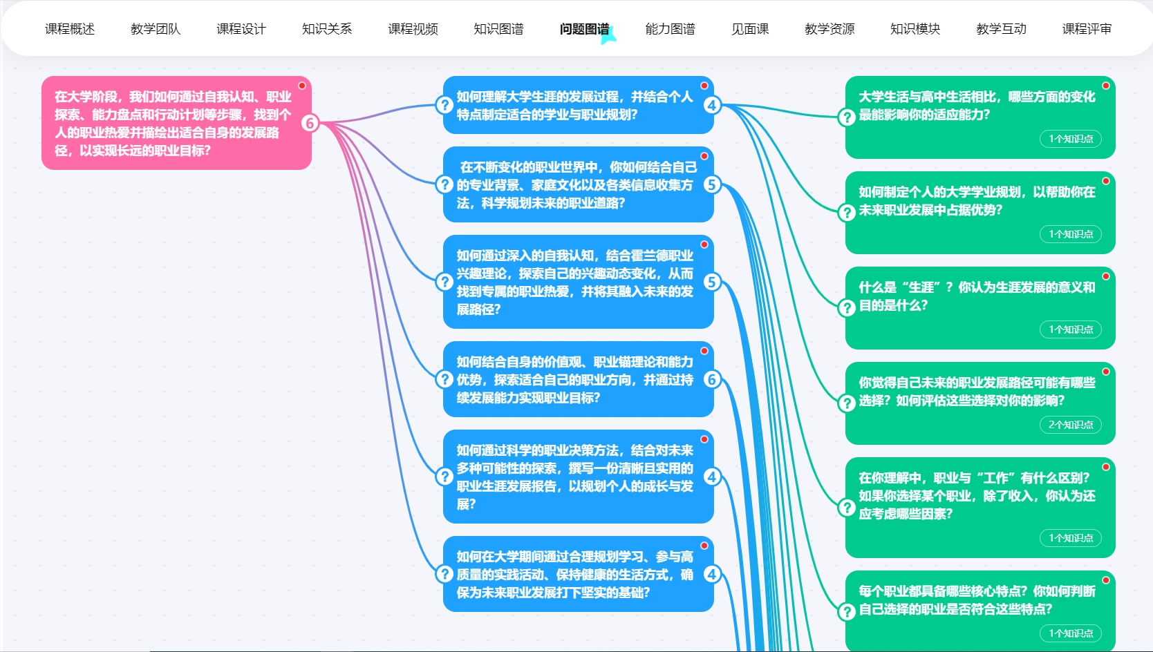《大学生职业发展》课程已建设完备,并上线进行全国共享,累计选课人数近两万人,选课学校13所,吸引近50所学校的公众学习者选修。课程以能力体系建设为基石,融合OBE教学理念,梳理知识体系,以支撑能力达成,再构建问题体系作为知识到能力的桥梁,最终建设成为教学资源、知识图谱、问题图谱和能力图谱的四维立体模式,清晰展现学生知识学习至能力达成的路径,满足个性化学习路径的匹配需求,真正做到因材施教。