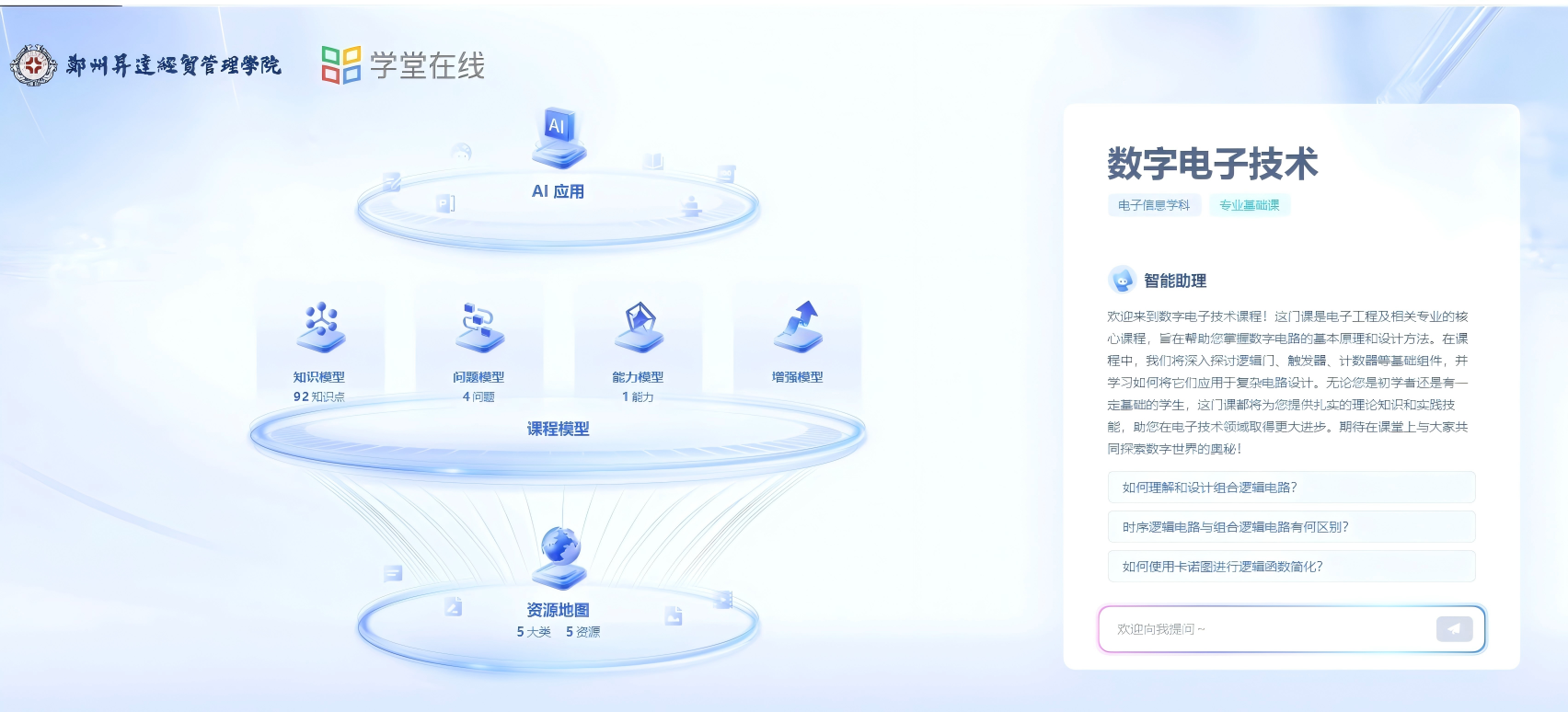 《基础会计》《数字电子技术》两门课程均依托于学堂在线平台开展建设。《基础会计》课程基于先前的慕课基础,构建了“知识-能力-问题”三大核心图谱,并顺利迈入第二个学期的教学实践阶段。AI技术全面融入课前、课中、课后各环节,打造出24小时智能学伴、智能备课、智能讲伴等关键应用模块,为学生提供真账实训、知识点答疑、学习生涯规划、科目小游戏等多样功能点。课程已上线全国首个AI课程平台“www.xuetang.ai”,截止目前,使用数据已接近7000人次,另有数字人等功能正在持续建设中。《数字电子技术》课程已完成知识模型、问题模型等搭建工作,后续将进一步完善课程内容,借助AI技术为学生带来更优质的学习体验,助力学生在电子技术领域深入探索。