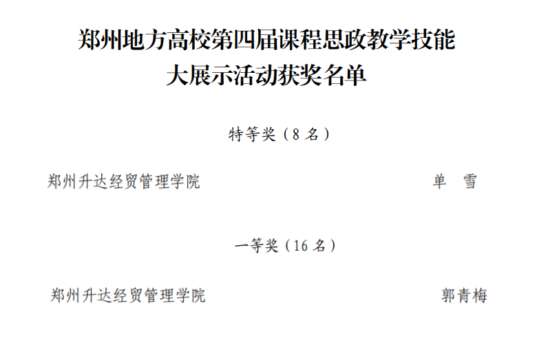 经过激烈角逐,我校学生发展中心单雪老师获特等奖,文法学院郭青梅老师获一等奖。两项大奖彰显我校在课程思政领域的示范引领作用。本次活动为郑州高校搭建了课程思政建设成果的检阅平台。未来我校将持续深化“思政—专业”双螺旋育人模式,为地方高校思政教育改革提供升达方案。