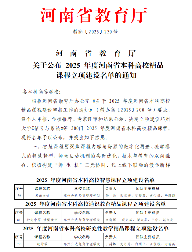 近日,河南省教育厅正式下发《关于公布2025年度河南省本科高校精品课程立项建设名单的通知》(教高〔2025〕230号),我校3门课程获批立项。这是我校持续推进课程建设与教学改革、着力提升人才培养质量的又一重要成果。