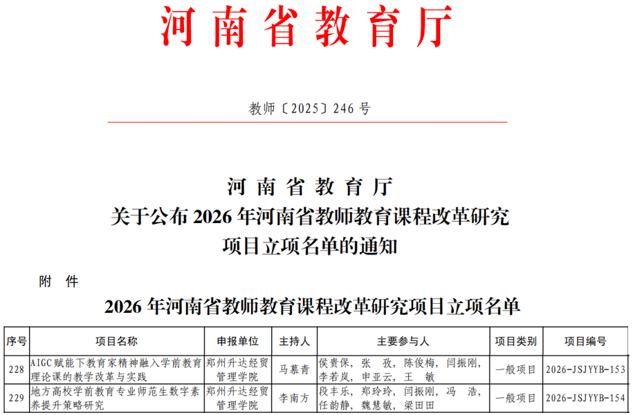 近日,河南省教育厅发布《关于公布2026年河南省教师教育课程改革研究项目立项名单的通知》(教师〔2025〕246号),我校2个项目获批立项。其中,马慕青主持的《AIGC赋能下教育家精神融入学前教育理论课的教学改革与实践》项目和李南方主持的《地方高校学前教育专业师范生数字素养提升策略研究》项目均获批一般项目。