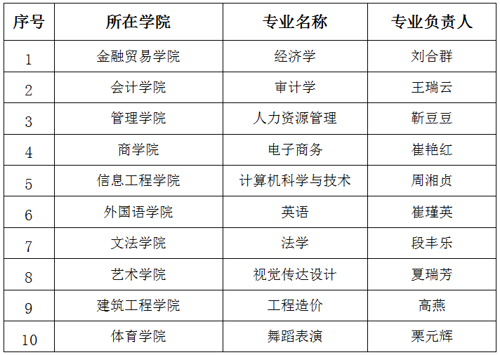 为贯彻落实《河南省人民政府办公厅关于加快一流专业建设提高人才培养质量的指导意见》(豫政办〔2022〕93号),加强专业内涵建设,突出优势专业示范引领作用,教务处组织了校级“一流本科专业”立项建设评选工作。经各学院遴选申报及校教学工作委员会专家评审,最终评选出金融贸易学院“经济学”等10个专业为第一批校级“一流本科专业”建设点。