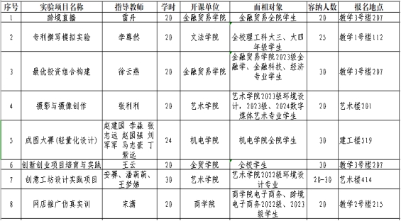 为培养学生实践能力、创新意识和创新精神,进一步完善学校实践育人体系,为学有余力的学生提供参与实验(实践)的机会,现将学校2024-2025学年第二学期开放实验项目公布如下,请符合报名条件的学生积极报名参加,具体项目见下表。
