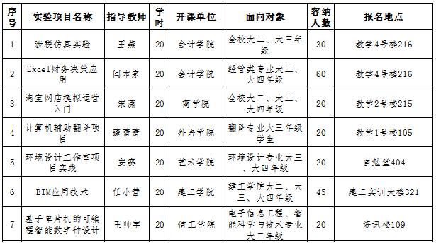 为培养学生实践能力、创新意识和创新精神,进一步完善学校实践育人体系,为学有余力的学生提供参与实验(实践)的机会,现将学校2022-2023学年第二学期开放实验项目公布如下,请符合报名条件的学生积极报名参加,具体项目见下表。