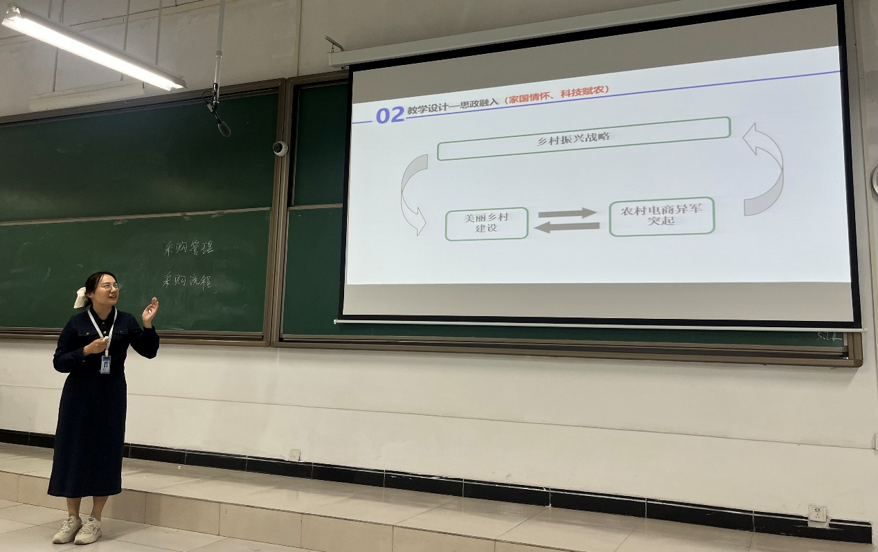 庞瑞博老师展示了《财务业务一体化实训》课程思政教学设计,以乡村振兴战略为教学切入点,深度融合数字技术与农产品采购管理教学,通过解析"数字赋能农业采购" 的创新模式,在系统讲解采购流程优化等专业知识的同时,积极引导学生以专业视角探索传统农业数字化转型路径。