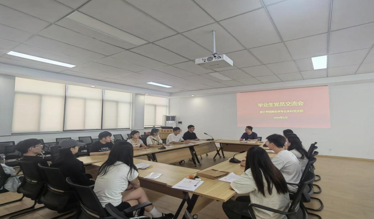 为做好2024届毕业生党员文明离校工作,会计学院税收学专业本科党支部于5月20日上午在教学四号楼209会议室召开毕业生党员交流会,会议由党支部书记许震主持,全体毕业生党员参加了会议。