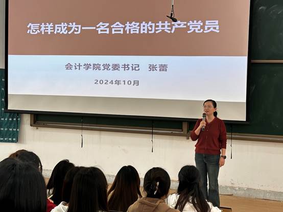 2024年10月29日,会计学院党委书记张蕾在教学4号楼118教室,以“怎样成为一名合格的共产党员”为主题,为我院第二十期发展对象、入党积极分子带来了一场生动的专题党课。