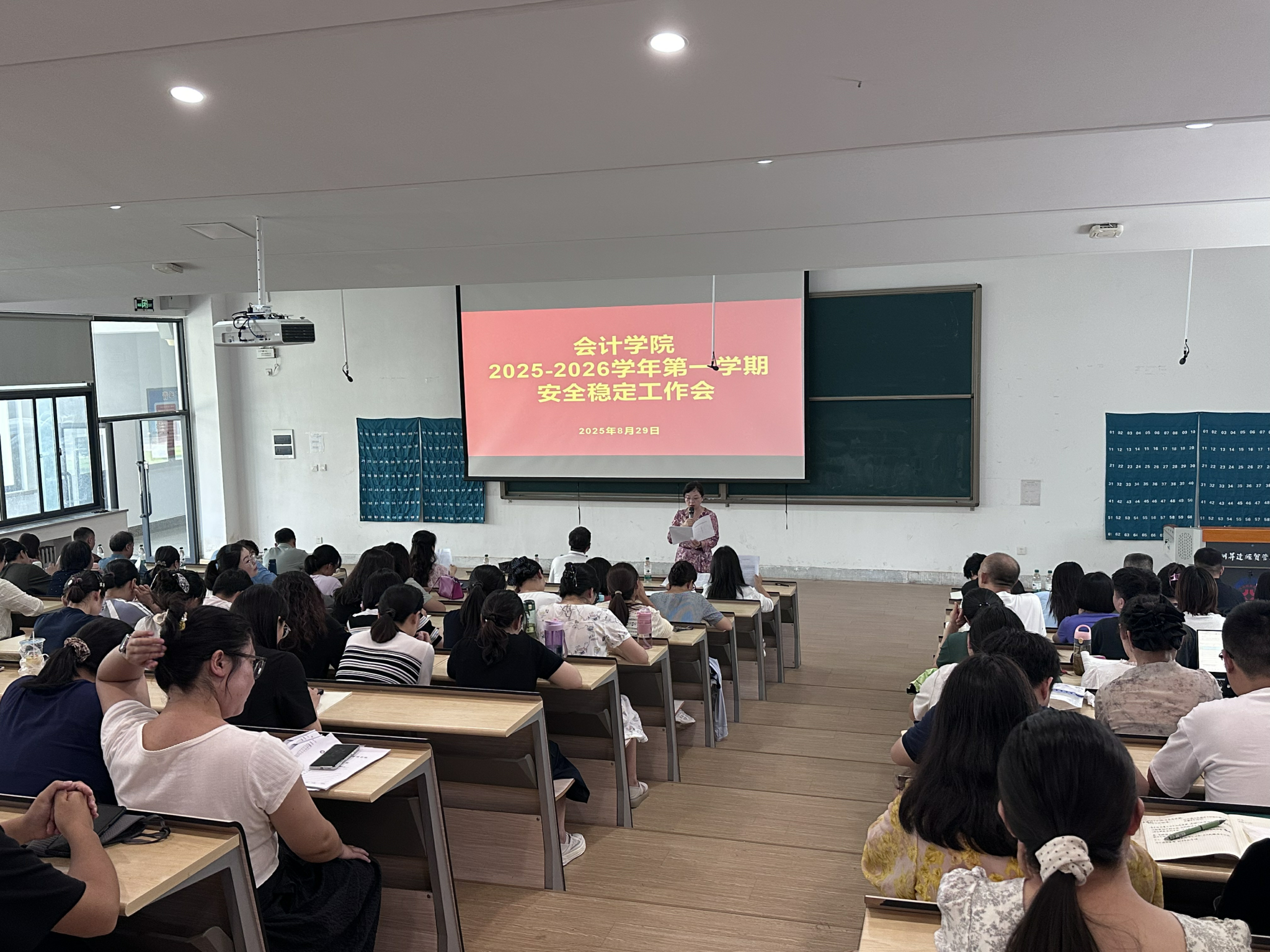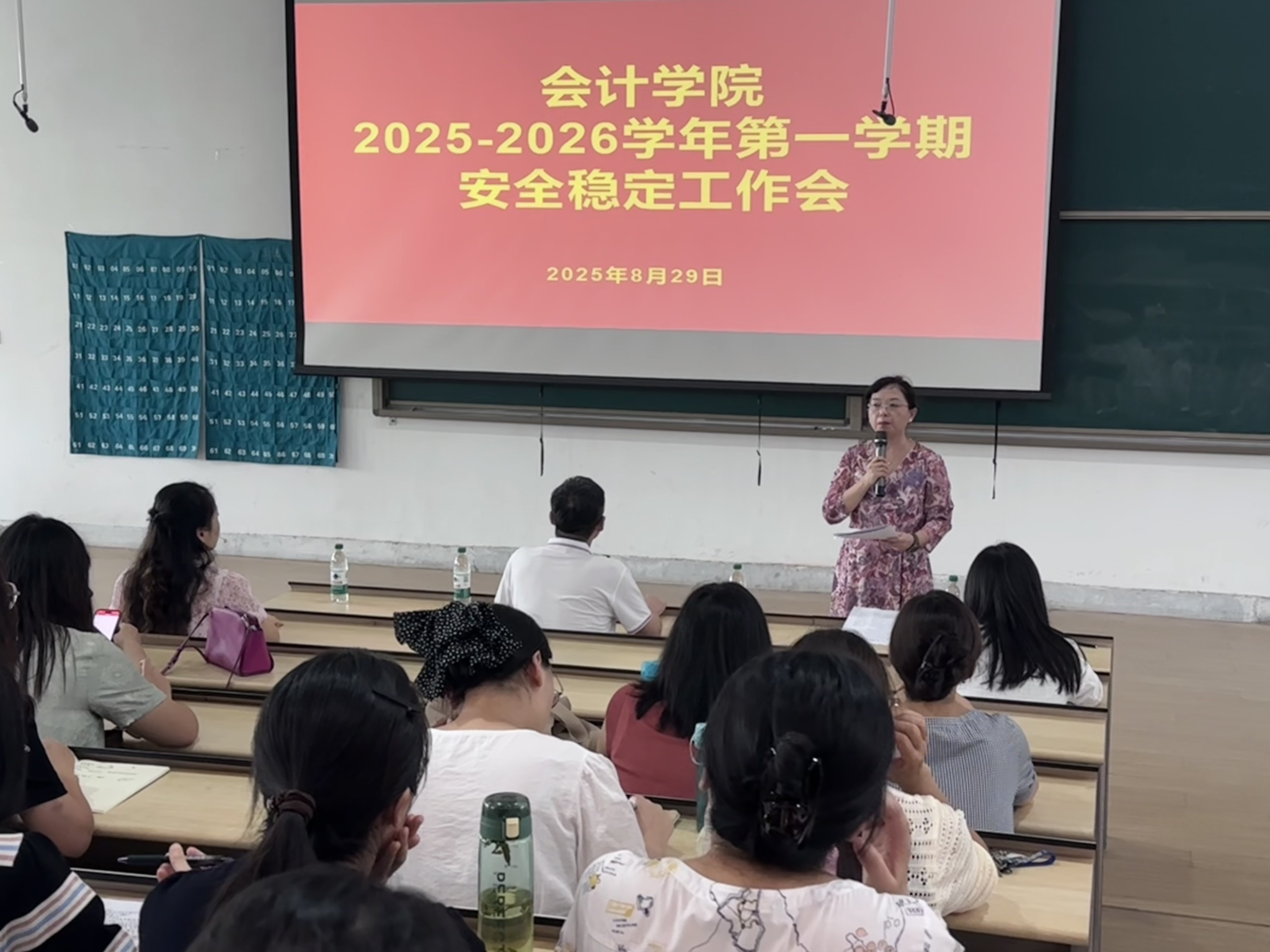 2025年8月29日,会计学院组织全院教职工在118教室召开秋季学期开学安全稳定工作会议。学院院长王宝庆,学院党委书记张蕾,副院长毕鹏翾、张新成,学院党委副书记陈刚出席会议。会议由学院党委书记张蕾主持。